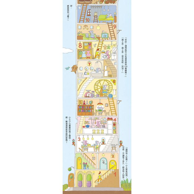 爬100層樓梯本來是寂寞、枯燥而且辛勞的苦差事,但是當二樓門上的乳酪和老鼠圖樣把小土引入室內,爬樓梯就變成認識朋友的新鮮事了。隨著每一個跨頁開展,十層一戶的動物住家剖現眼前。每一戶的形狀、顏色,以及和天空接觸的方式,各有風格;樓內的室內擺設、裝置和活動,也因為動物的習性而各有奇趣。這樣一來,只在同一定點往高處攀升的小土和讀者,每爬高一層樓,就有好多細節可以觀察,有好多「家」的故事可以說了。