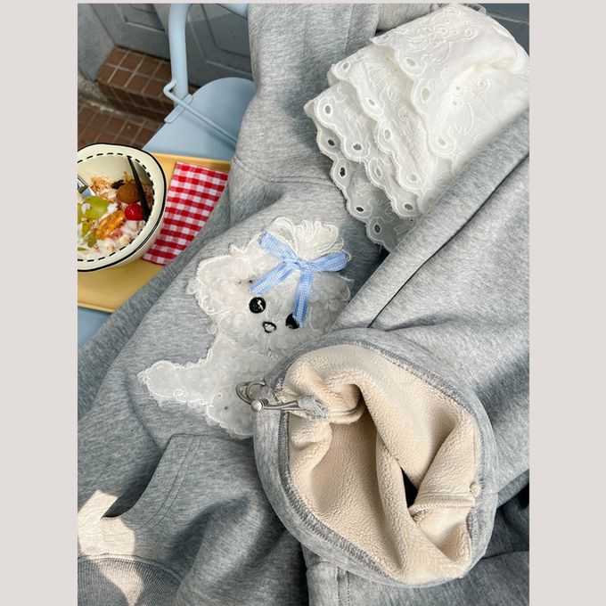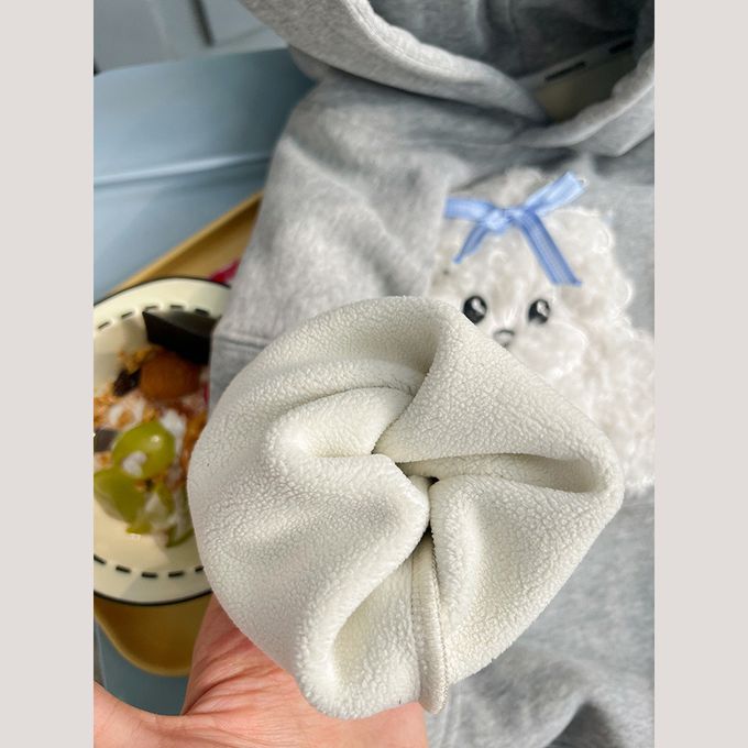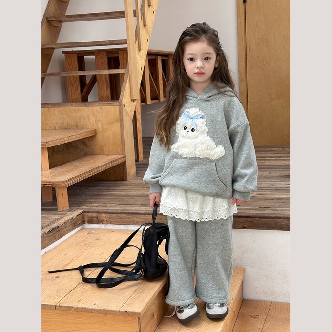 韓版立體捲毛小狗繡花連帽棉衛衣運動褲套裝-連帽衛衣+長褲-氣質灰