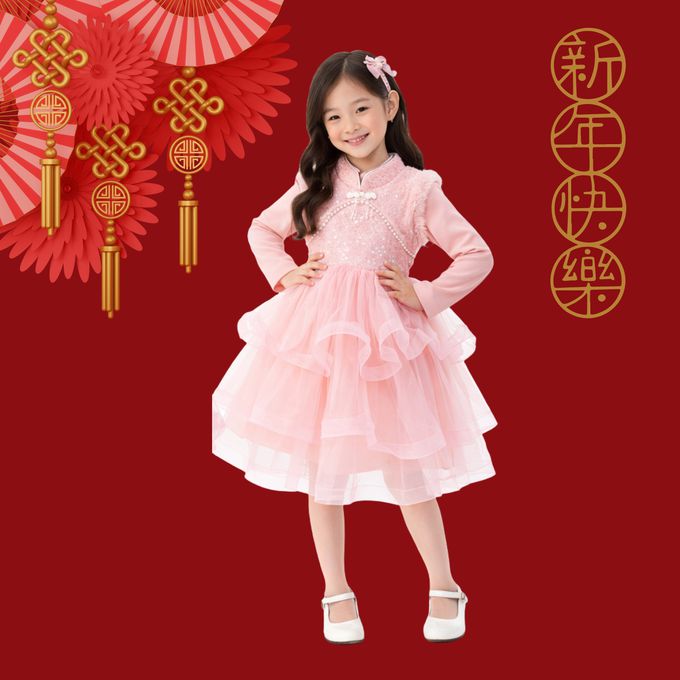 新年拜年淑女新式旗袍領鋪棉波浪網紗洋裝-淺粉色