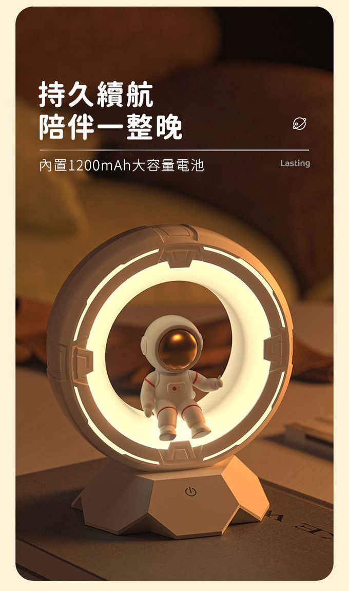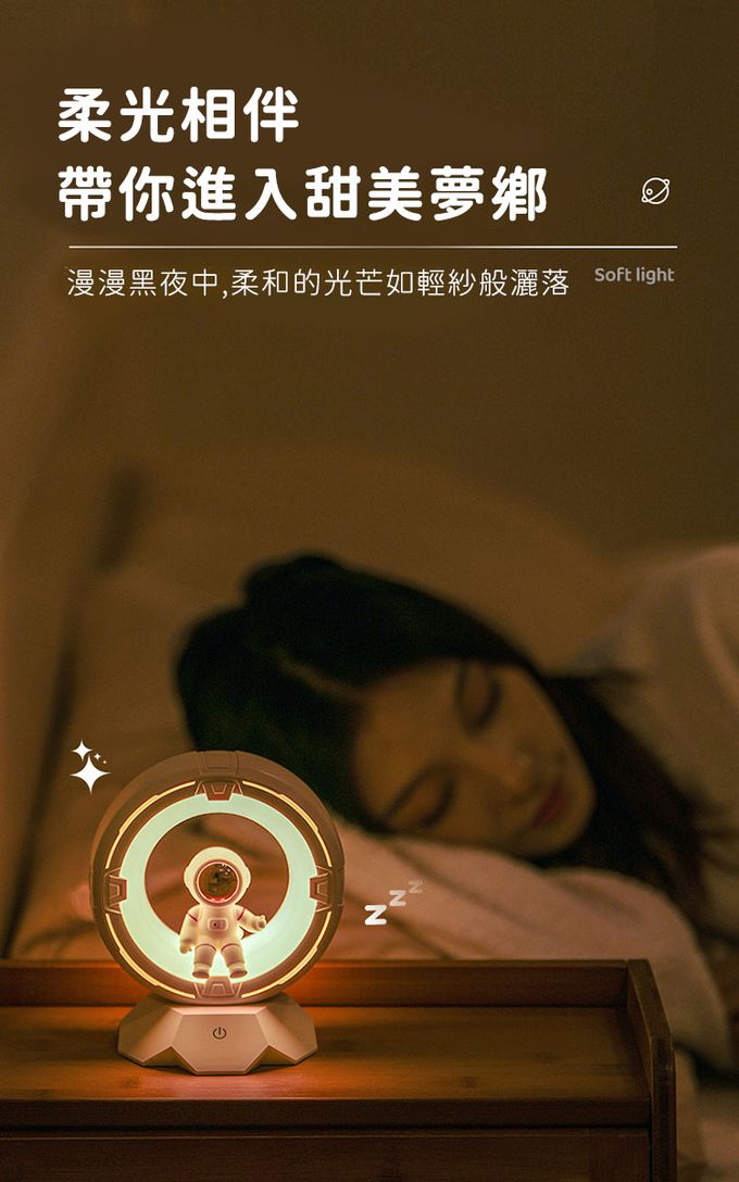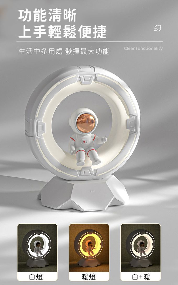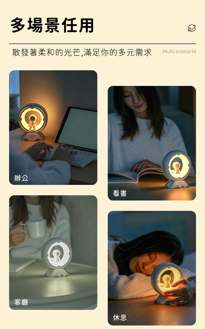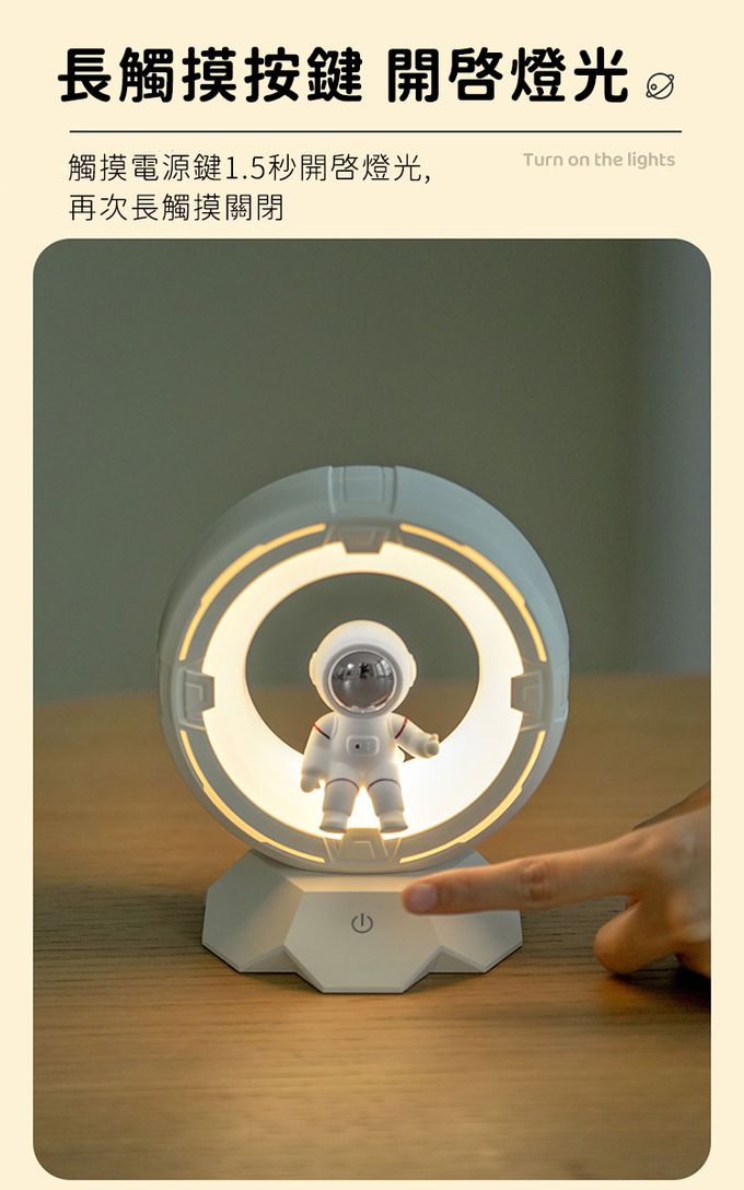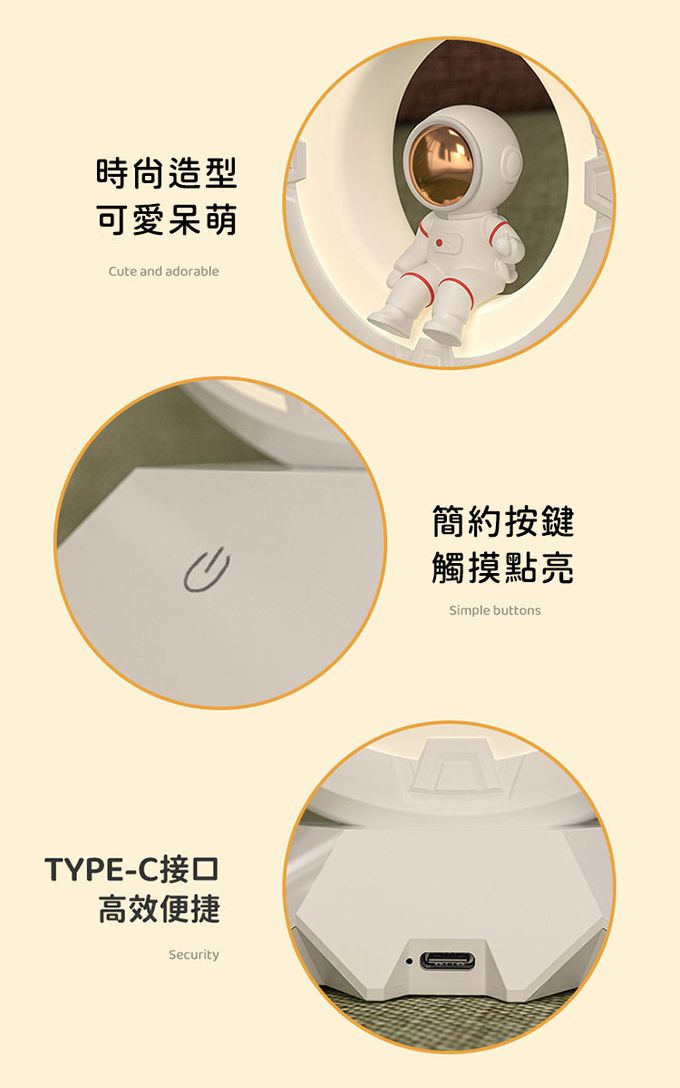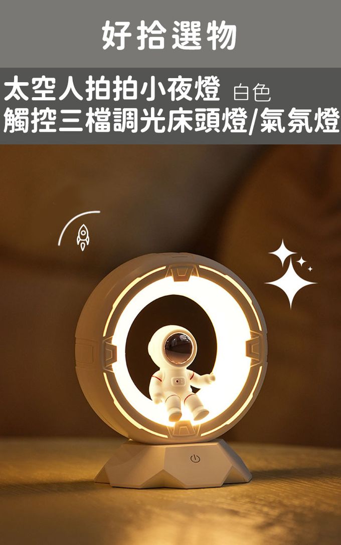 品名:太空人拍拍小夜燈/觸控三檔調光床頭燈/氣氛燈顏色:白色材質:ABS、電子元件、PC、矽膠產品尺寸:12.8x10.2x15cm包裝尺寸:13x10.3x15.6cm產品重量:198.5g充電方式:TYPE-C轉USB接頭產地:中國