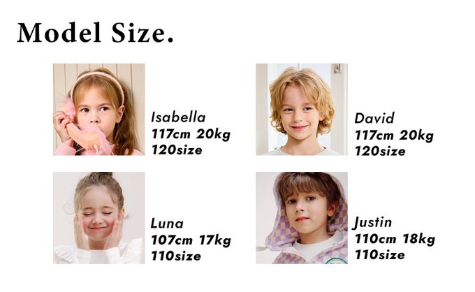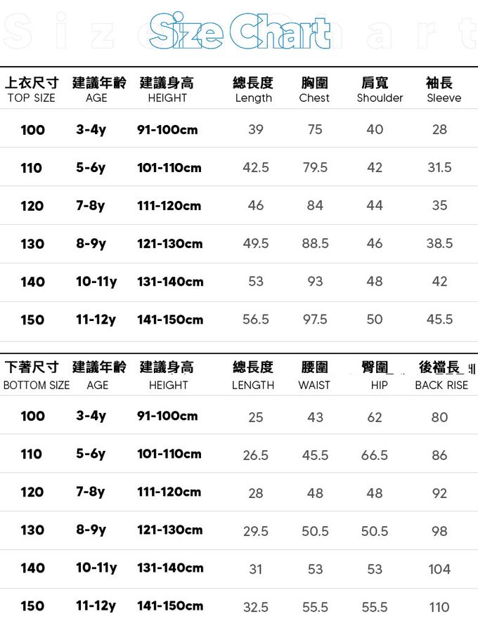 1. 尺寸表單位皆為公分(cm),實際尺寸會因布料彈性、水洗、測量起迄點等因素略有誤差。建議參考孩子平時穿著衣物尺寸進行選購。