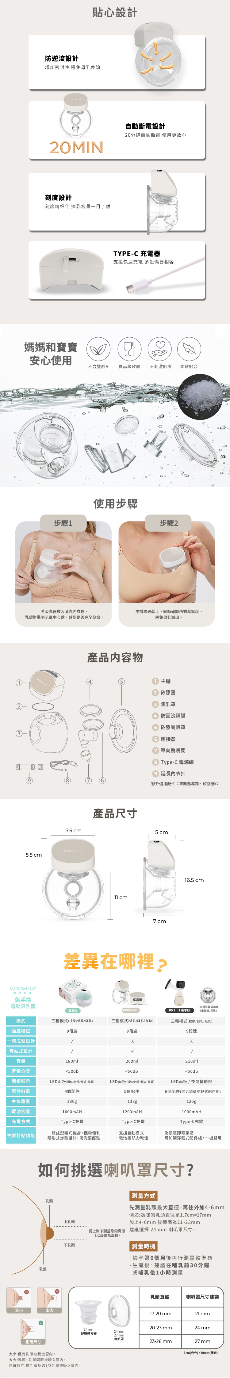 內容物:主機、Type-C電源線、矽膠喇叭罩24mm、矽膠防回流隔膜、單向鴨嘴閥、集乳罩、延長內衣扣、額外備用配件(單向鴨嘴閥x1﹑矽膠密封圈x2)