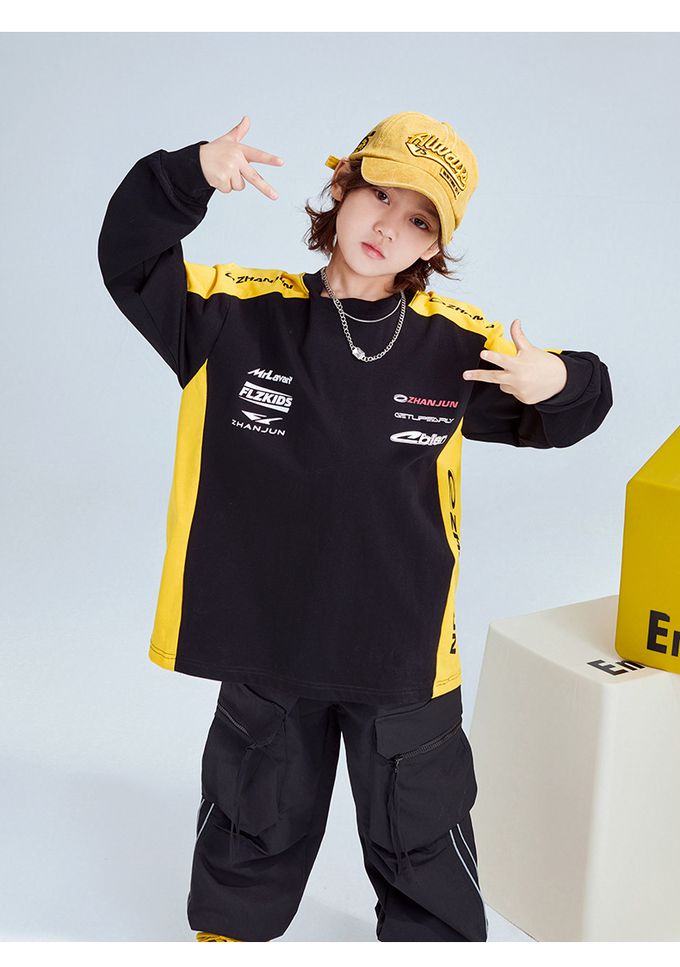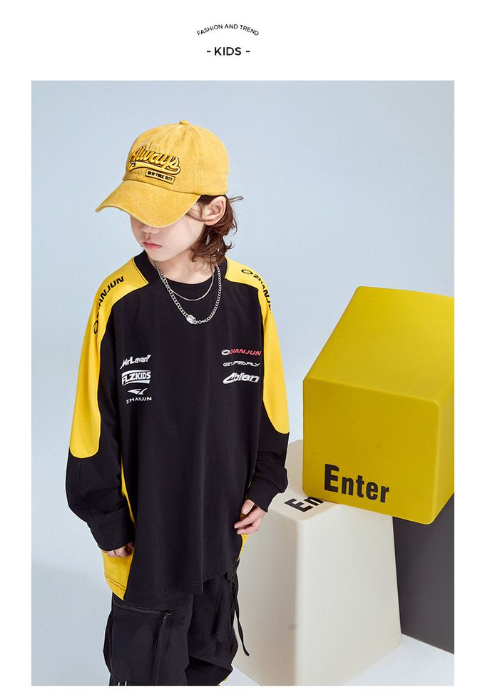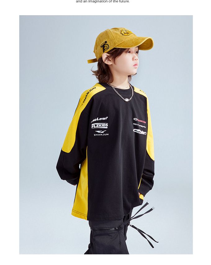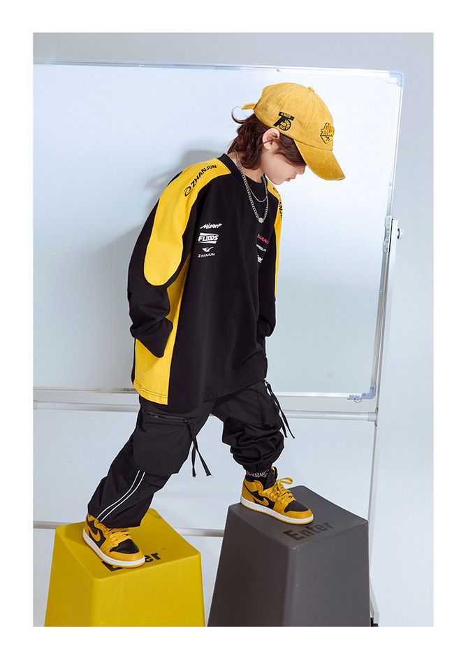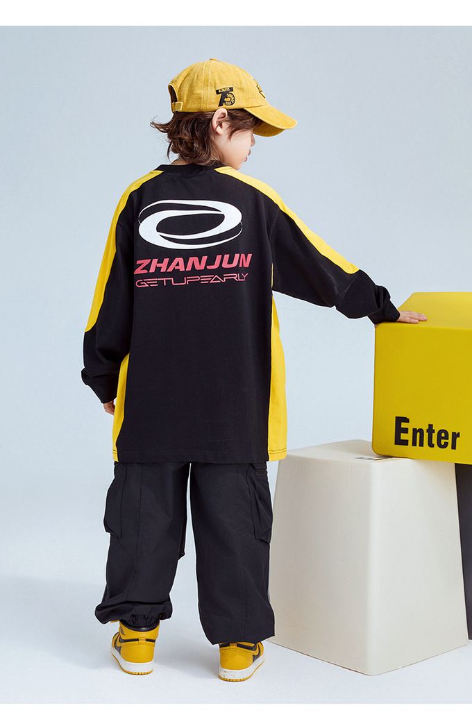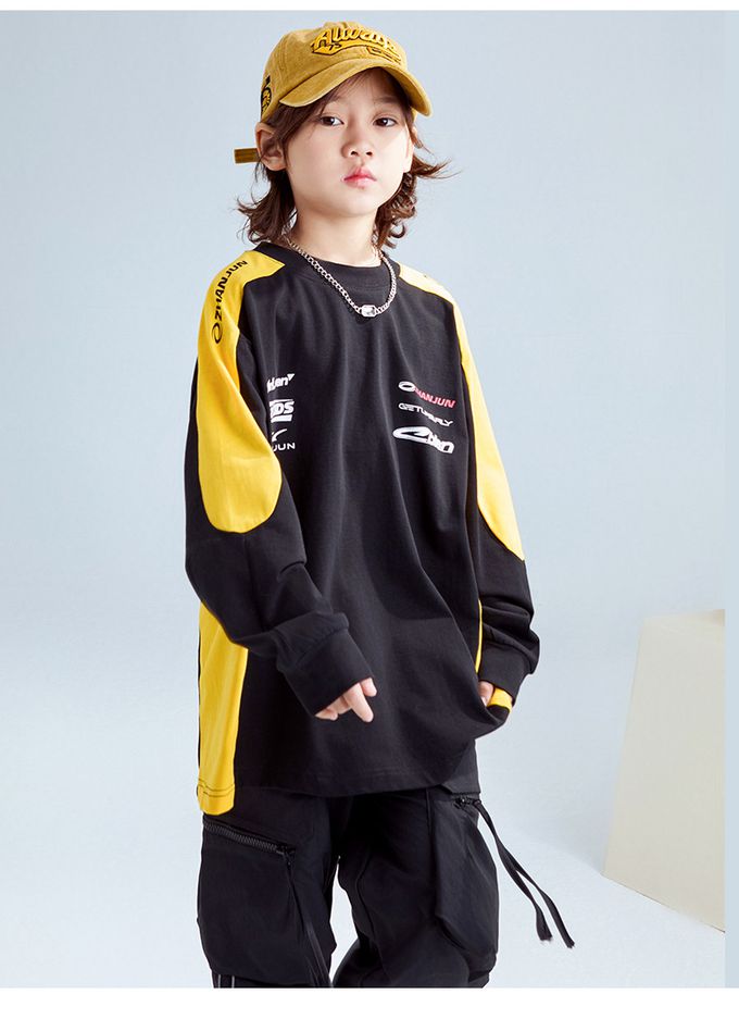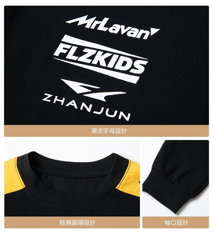 純棉圓領寬鬆長袖上衣-拼色印花-黑色
