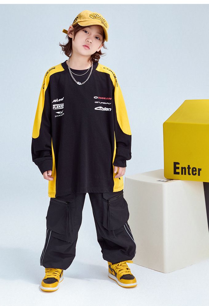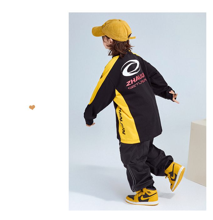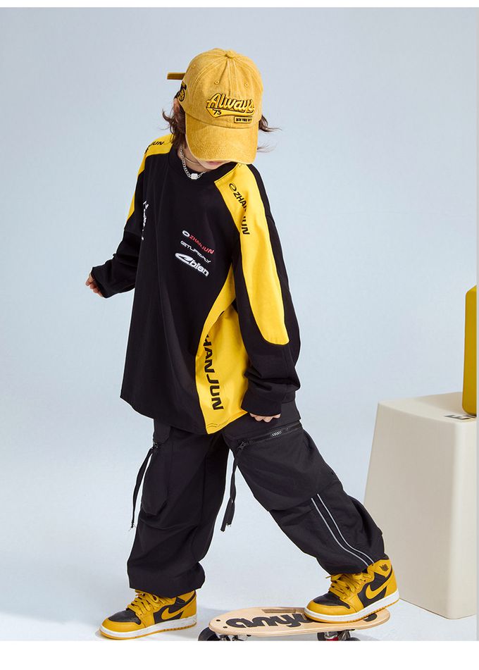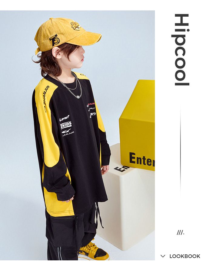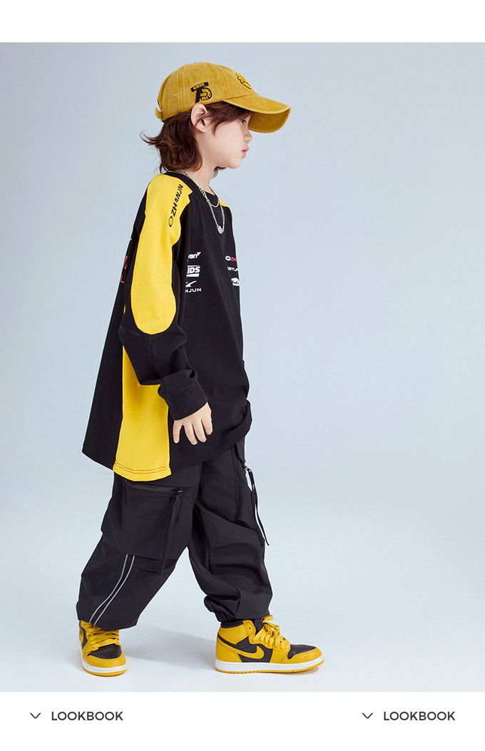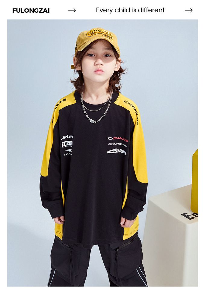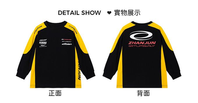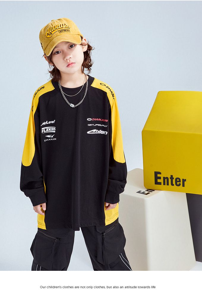 純棉圓領寬鬆長袖上衣-拼色印花-黑色