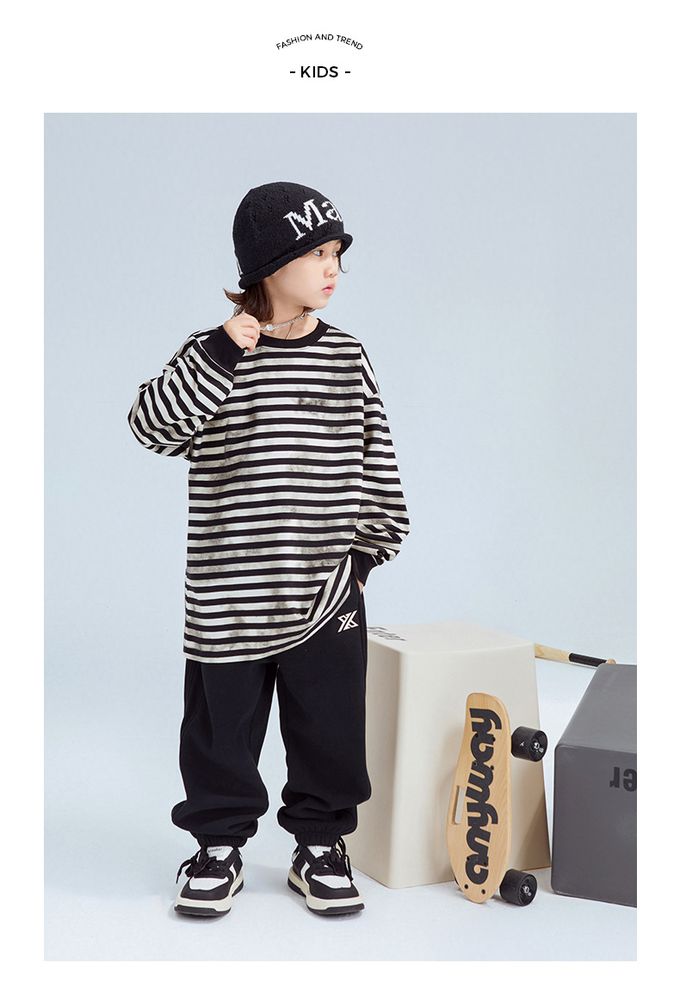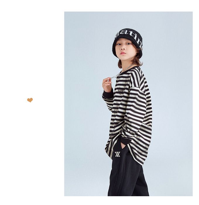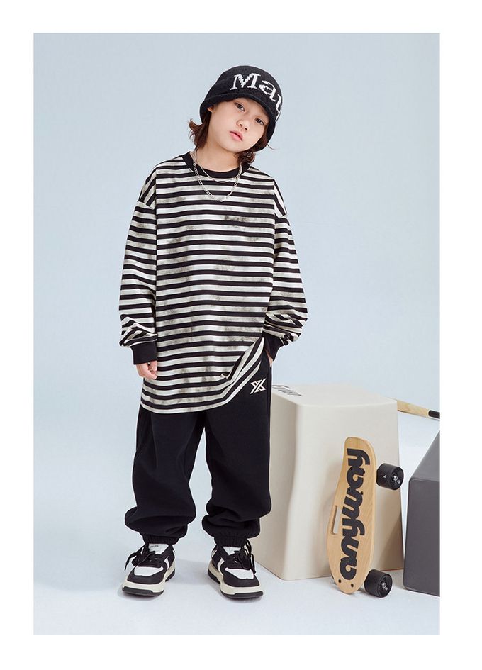 圓領寬鬆長袖上衣-暈染條紋-黑色