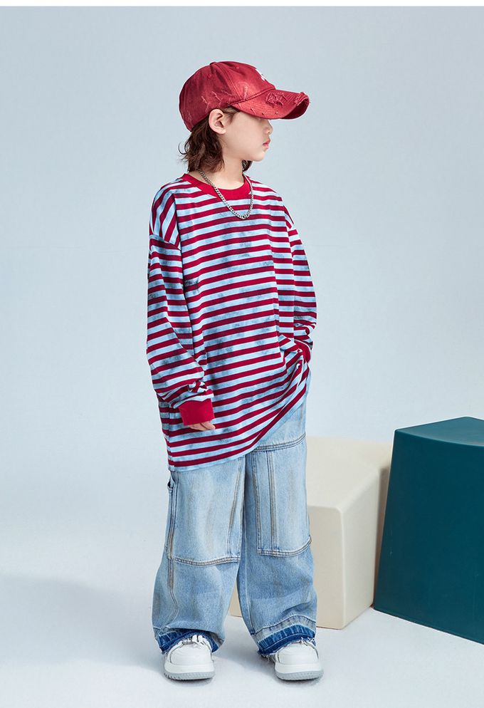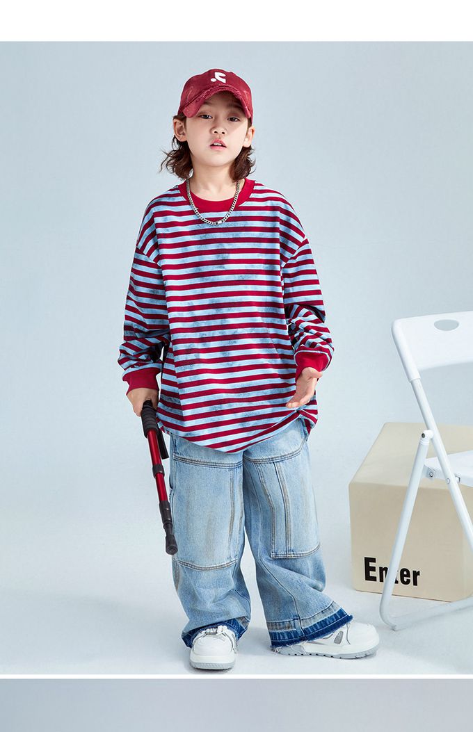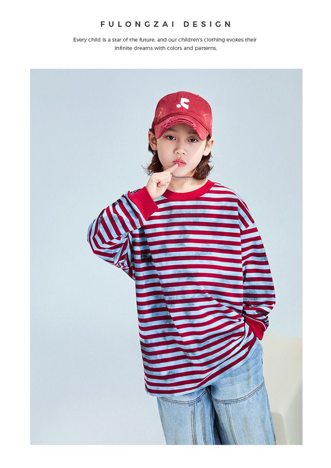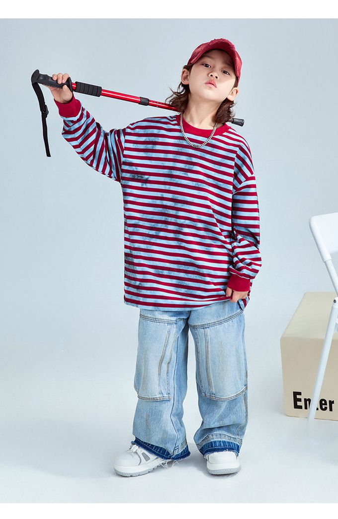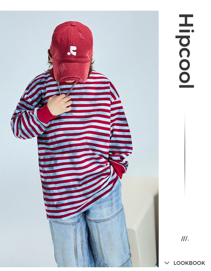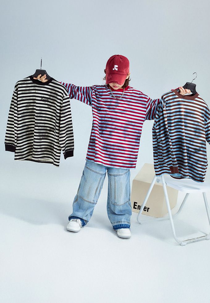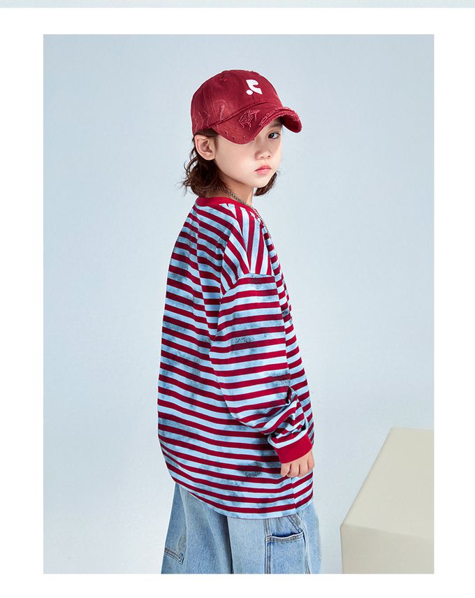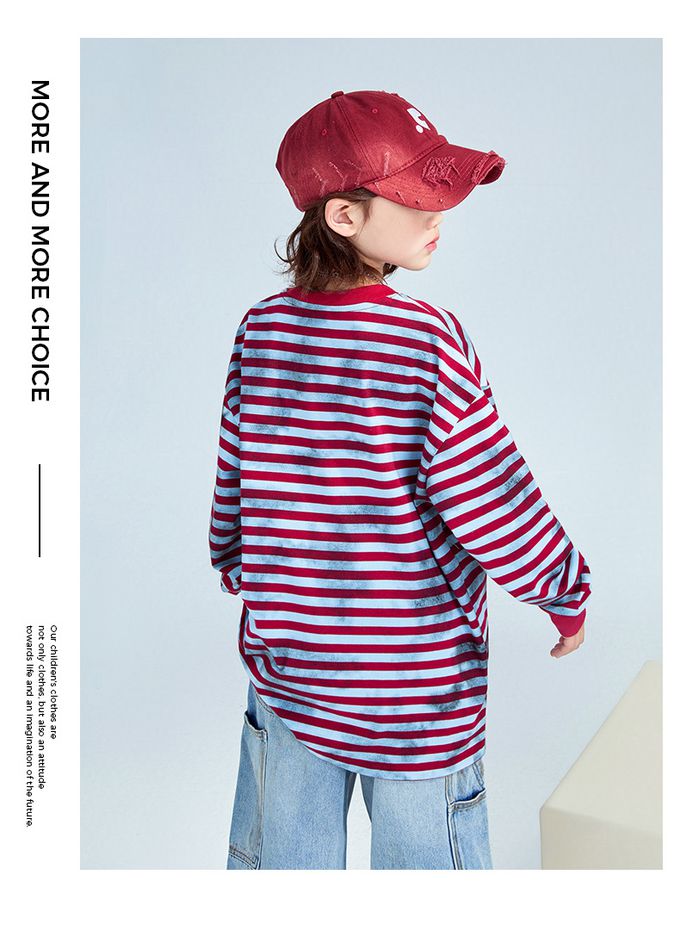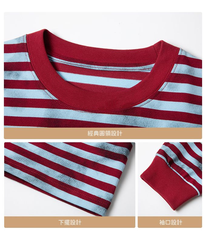 圓領寬鬆長袖上衣-暈染條紋-紅色