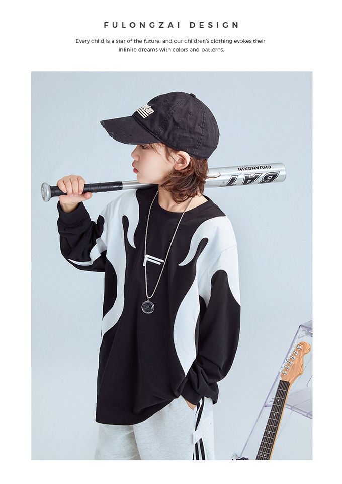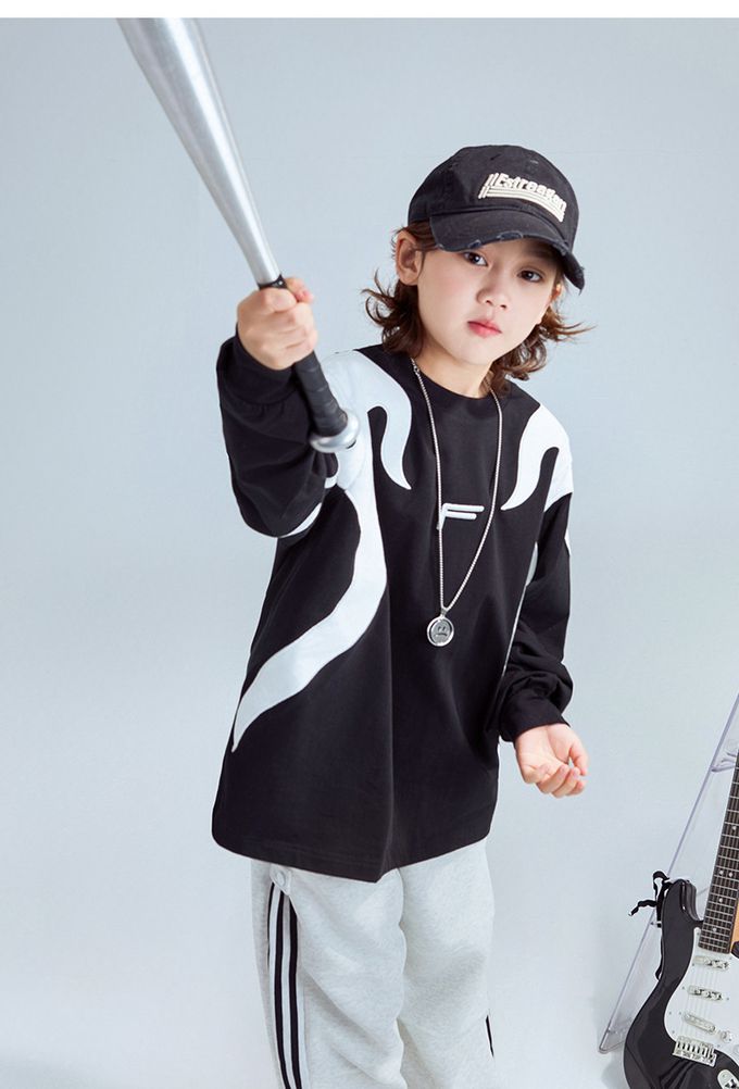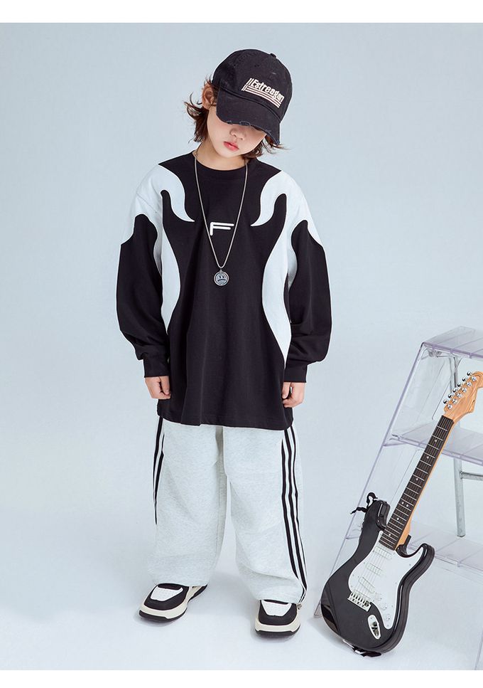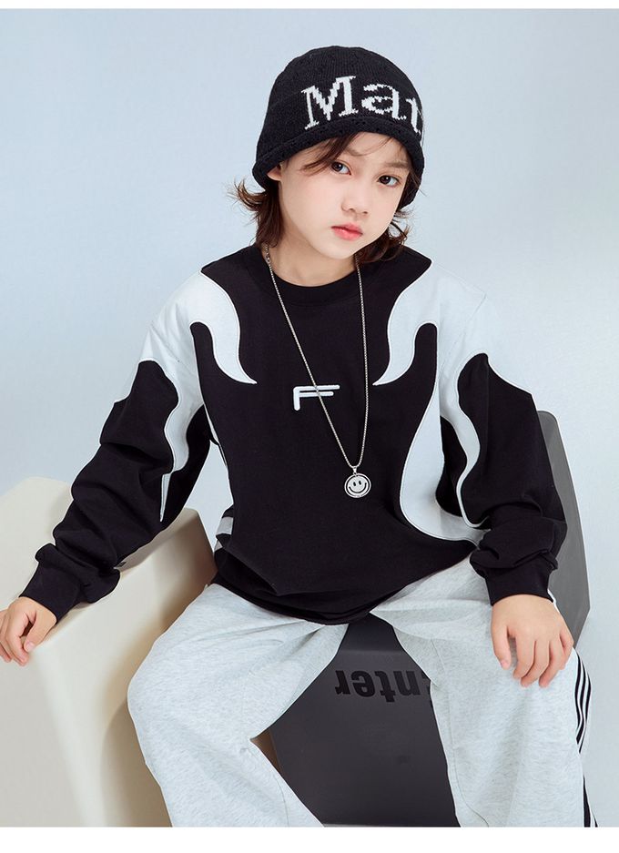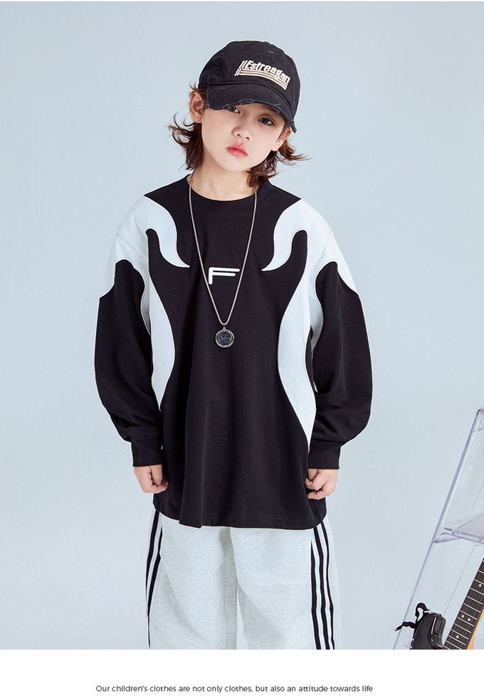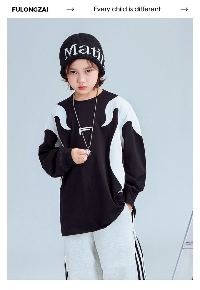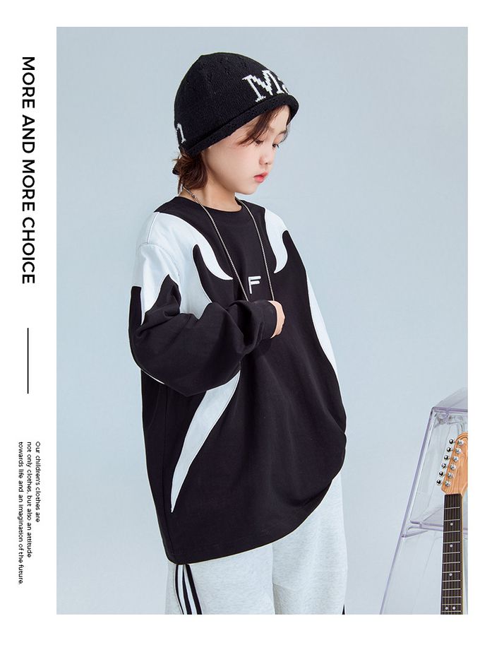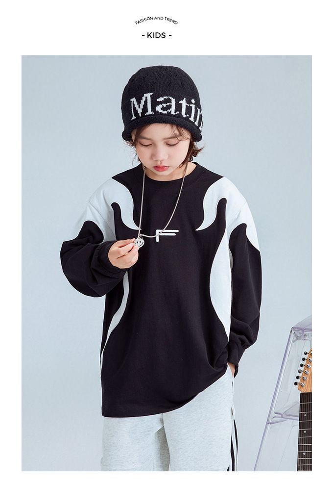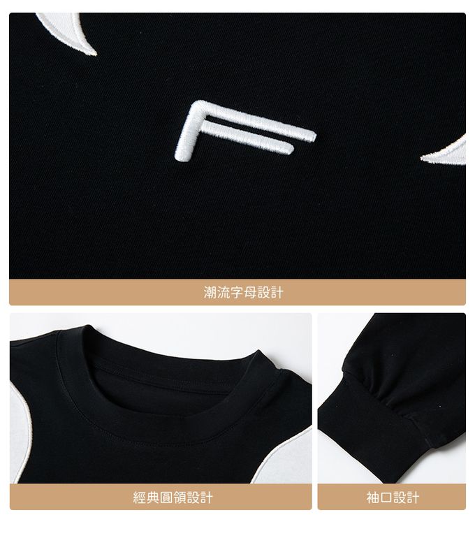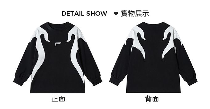 純棉圓領寬鬆長袖上衣-拼色色塊F-黑色