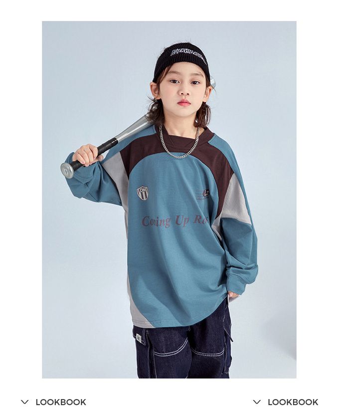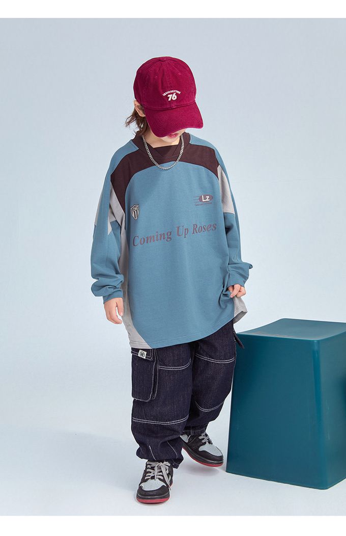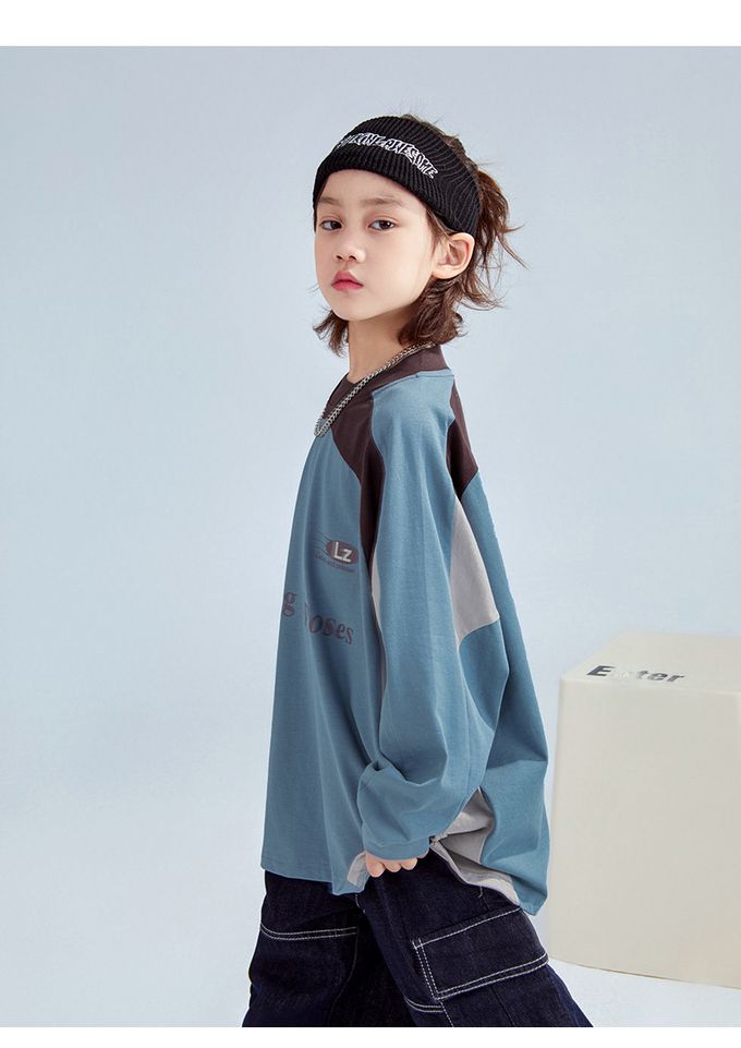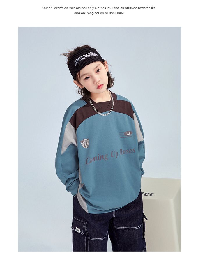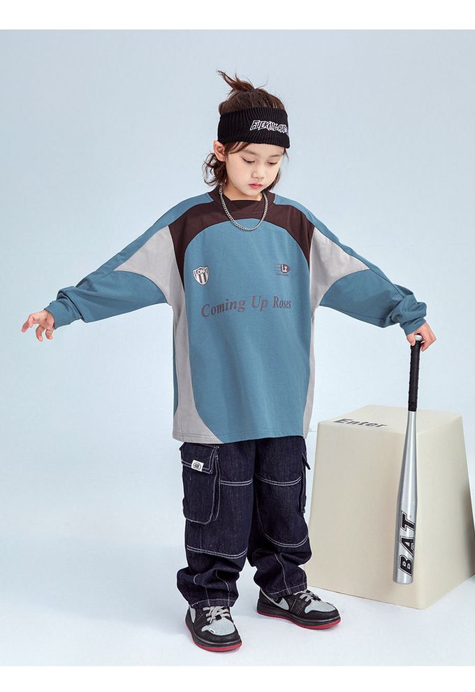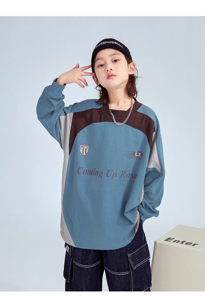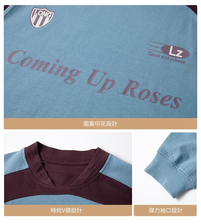純棉圓領寬鬆長袖上衣-拼色印花-藍色