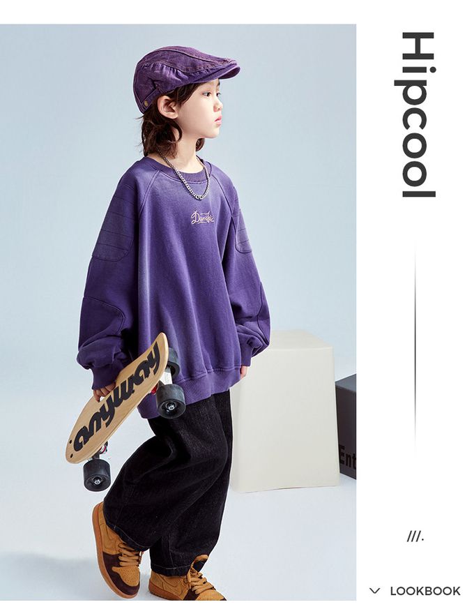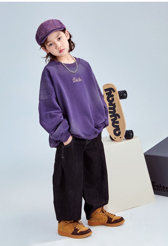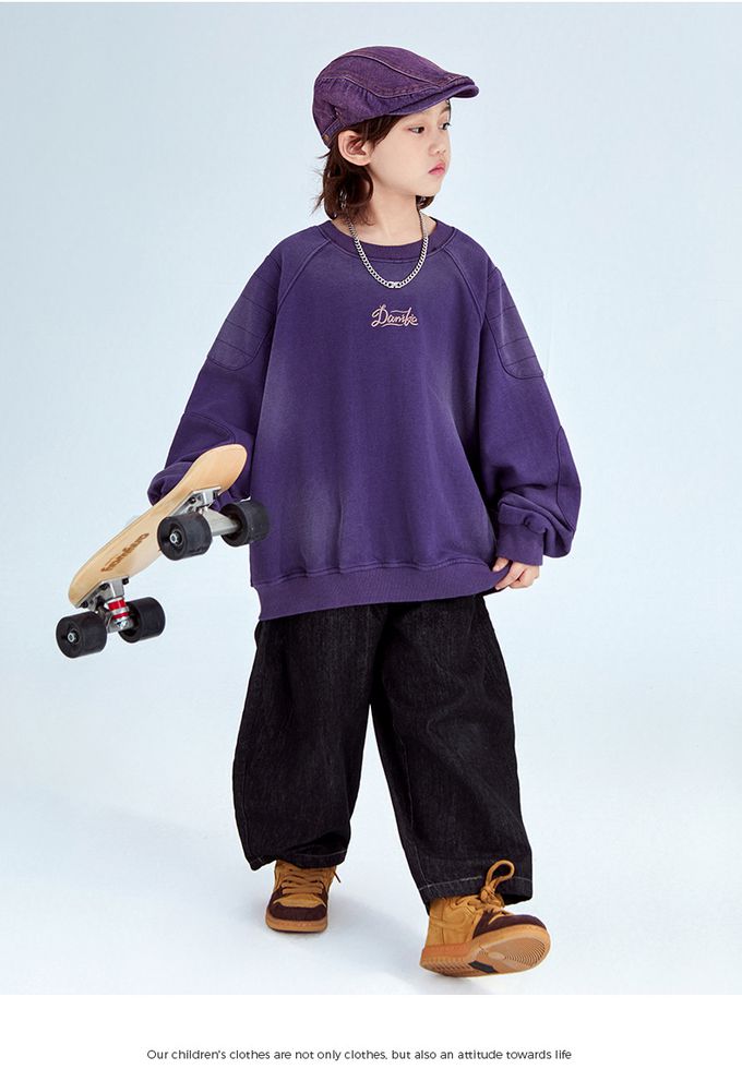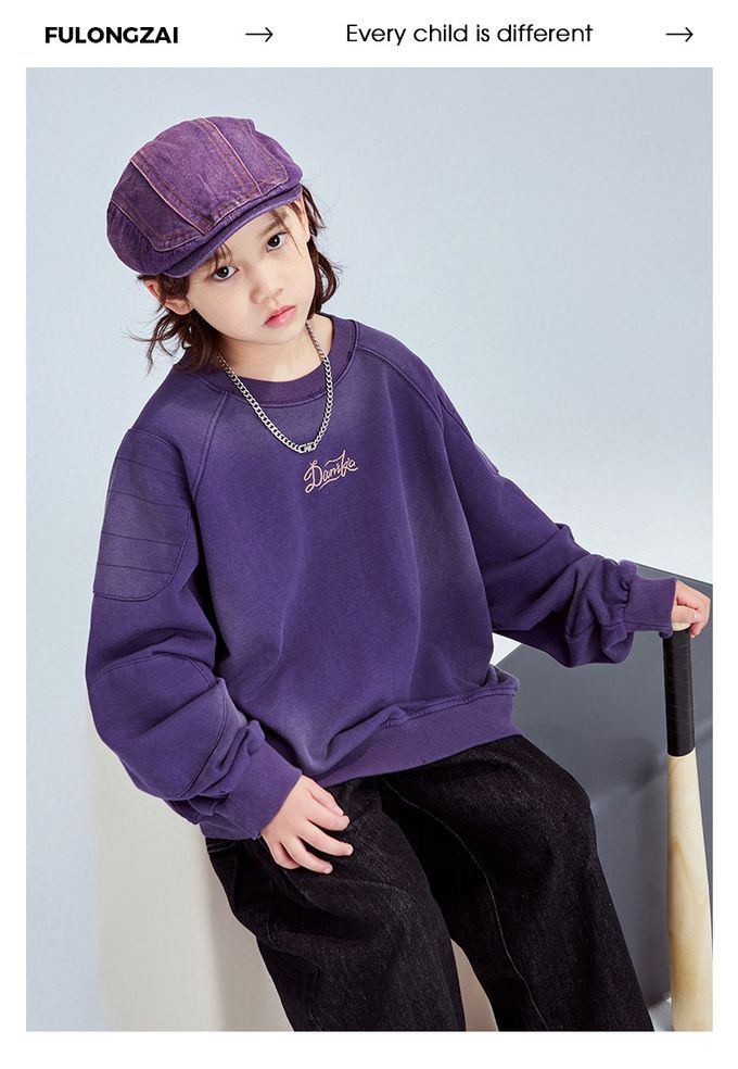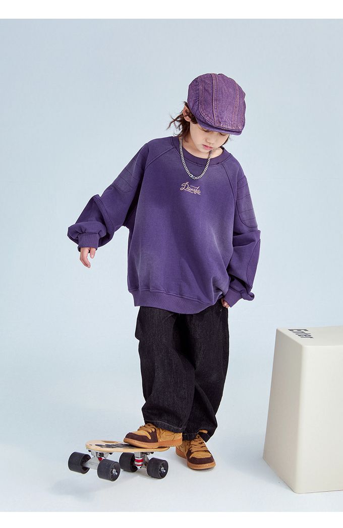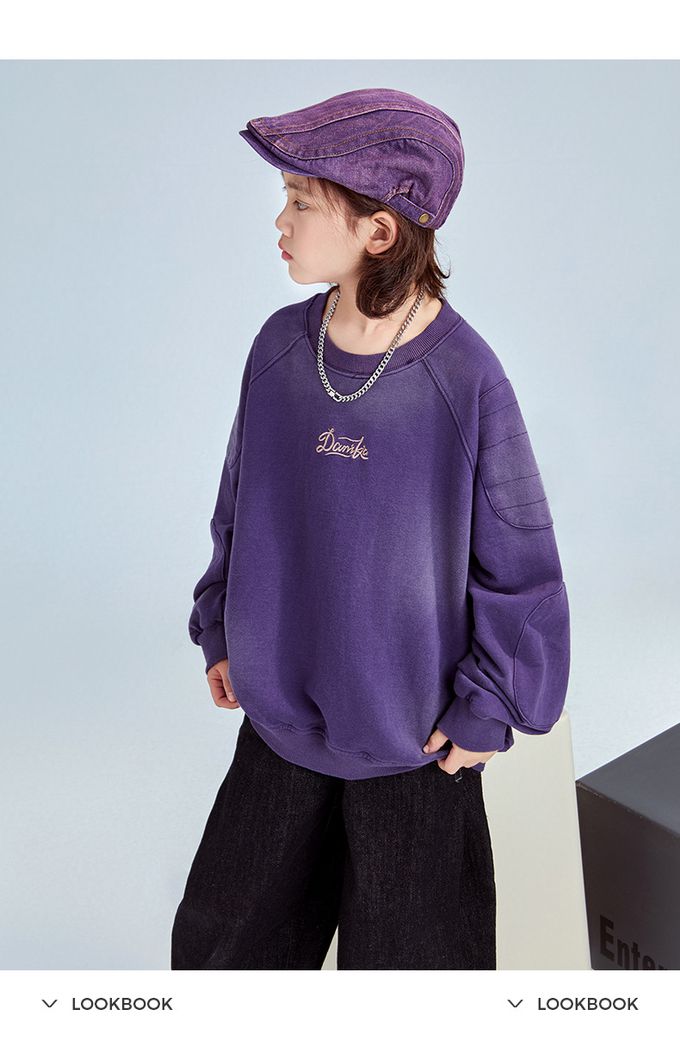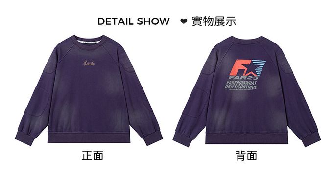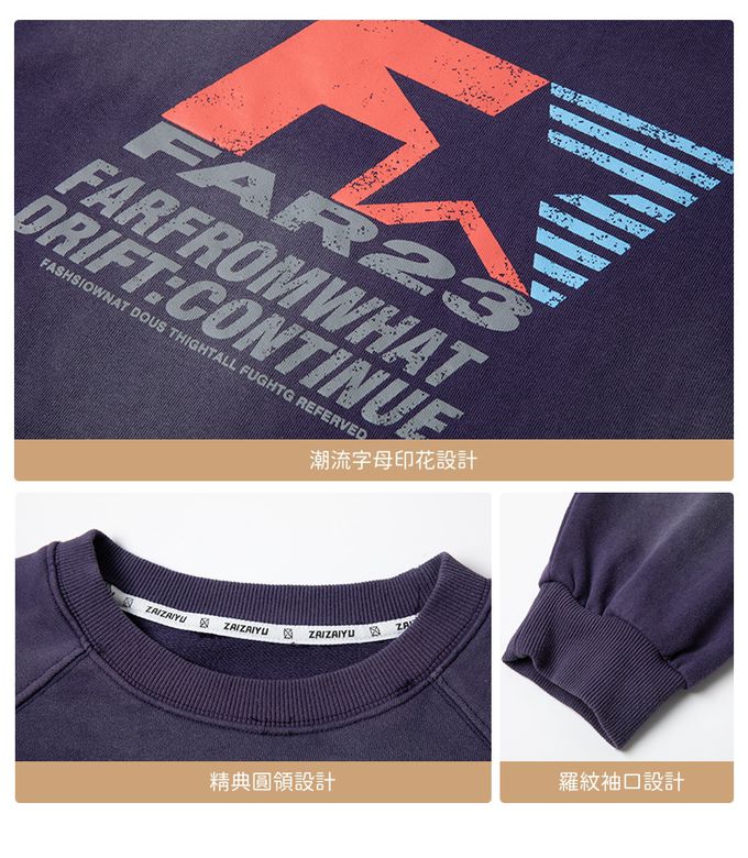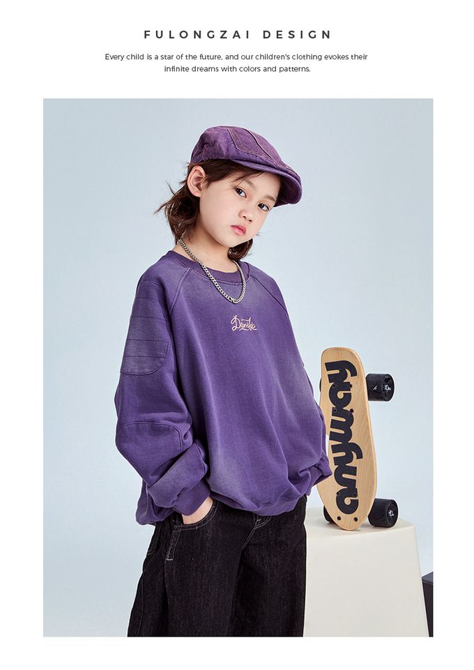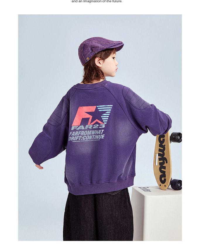 純棉圓領寬鬆長袖上衣-袖拼布+後印花-紫色