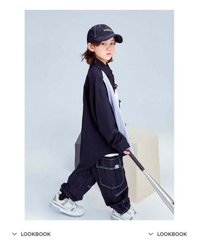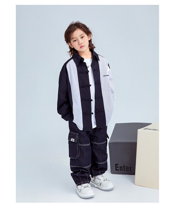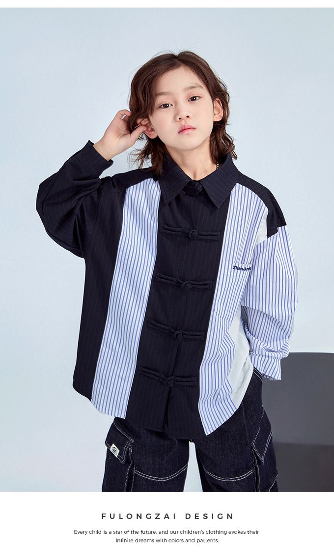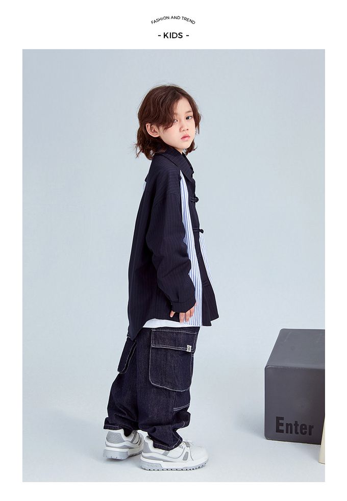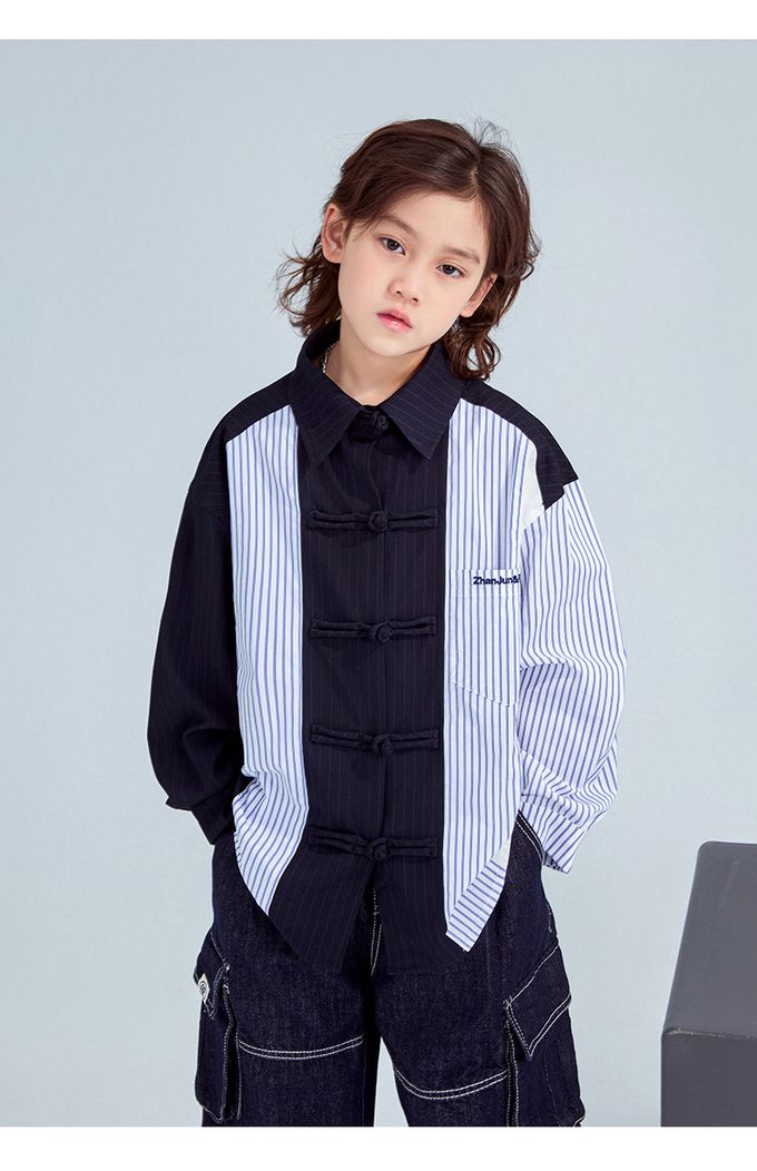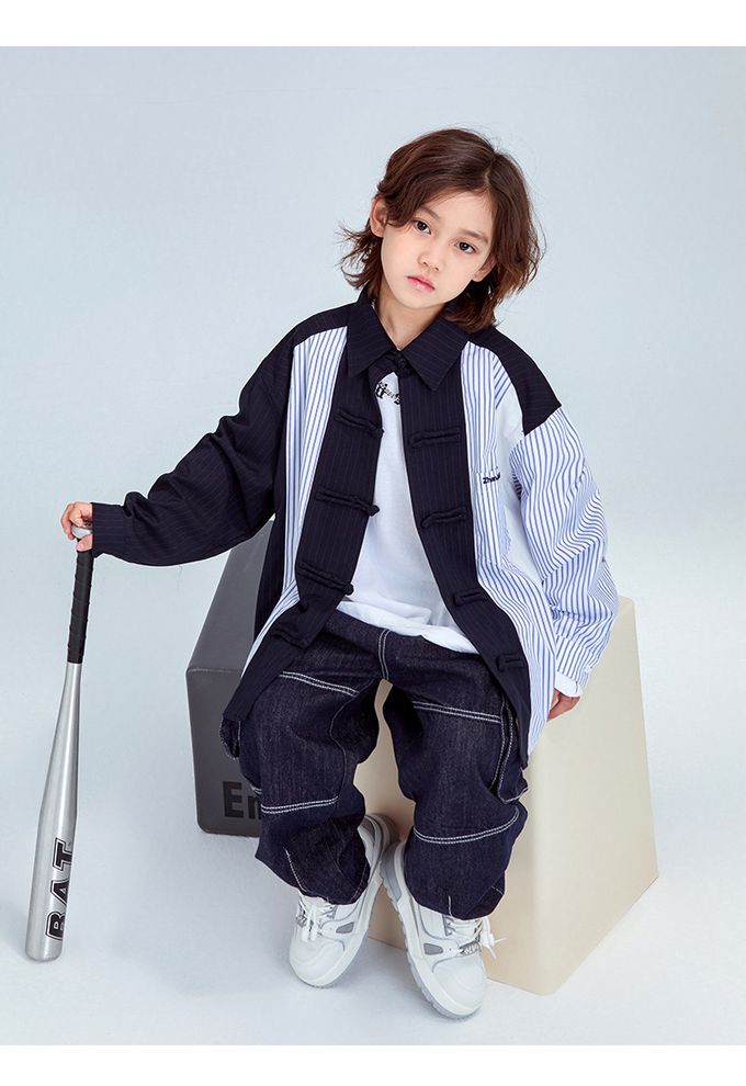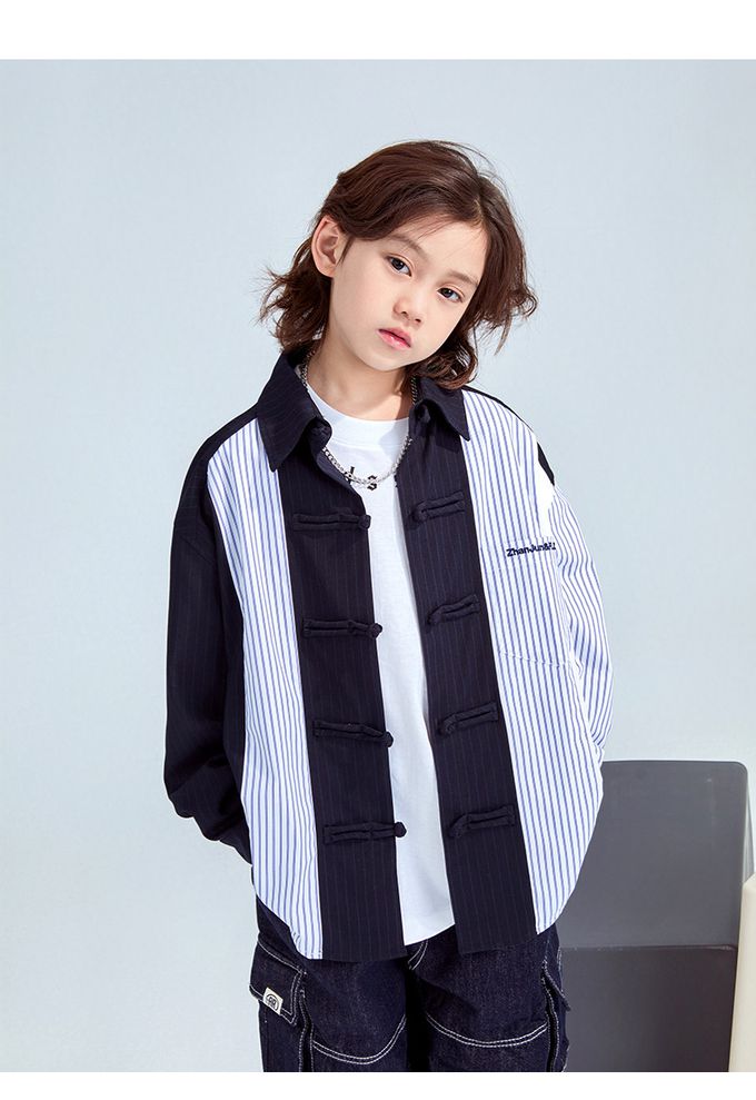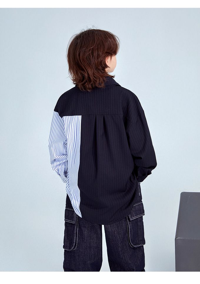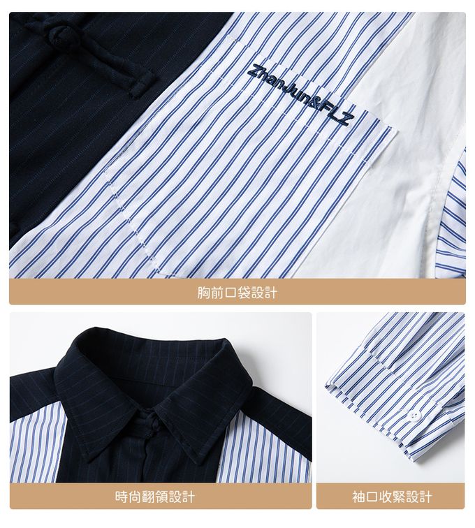 FULONGZAI - 率性異材質拼接長袖襯衫-條紋-藍+白