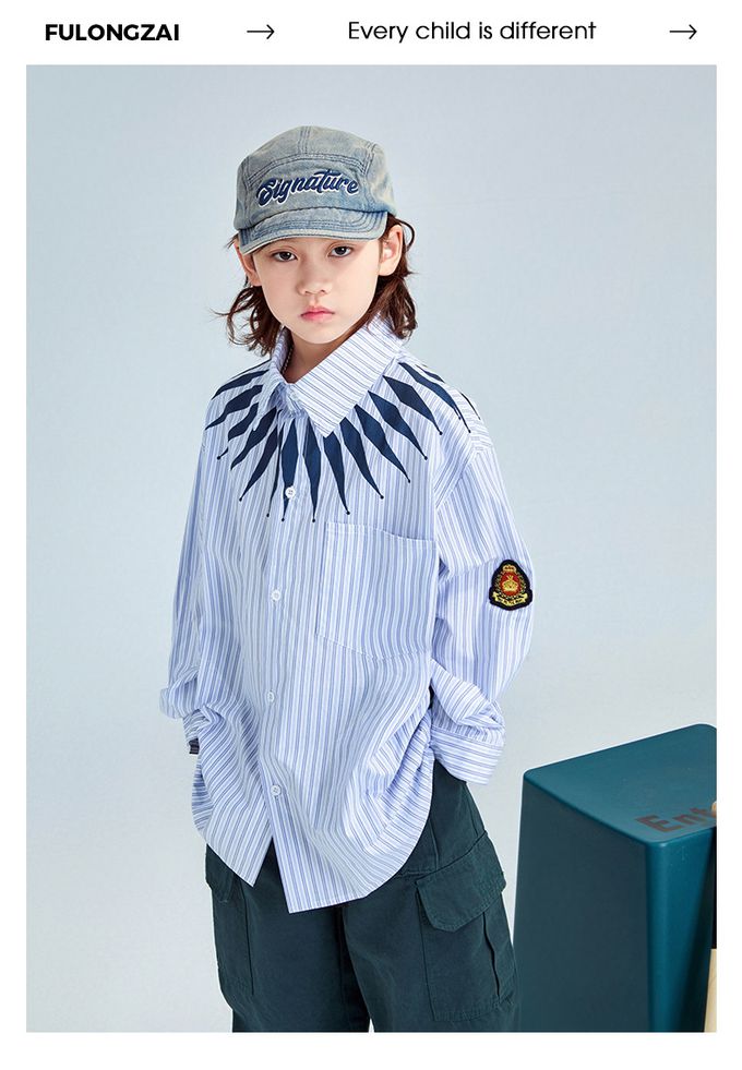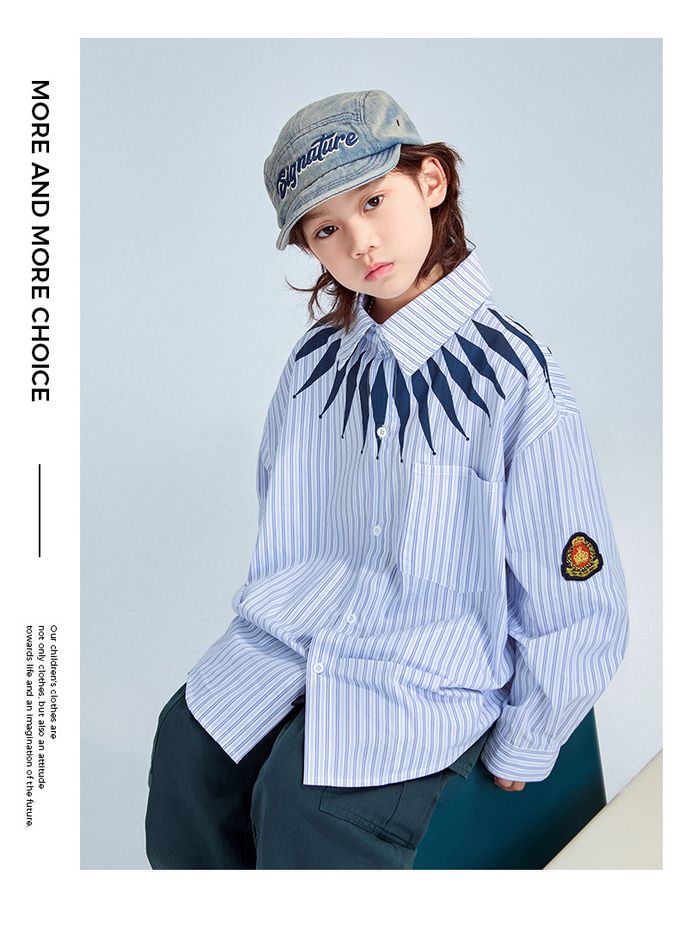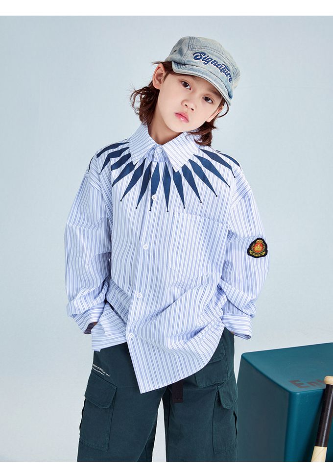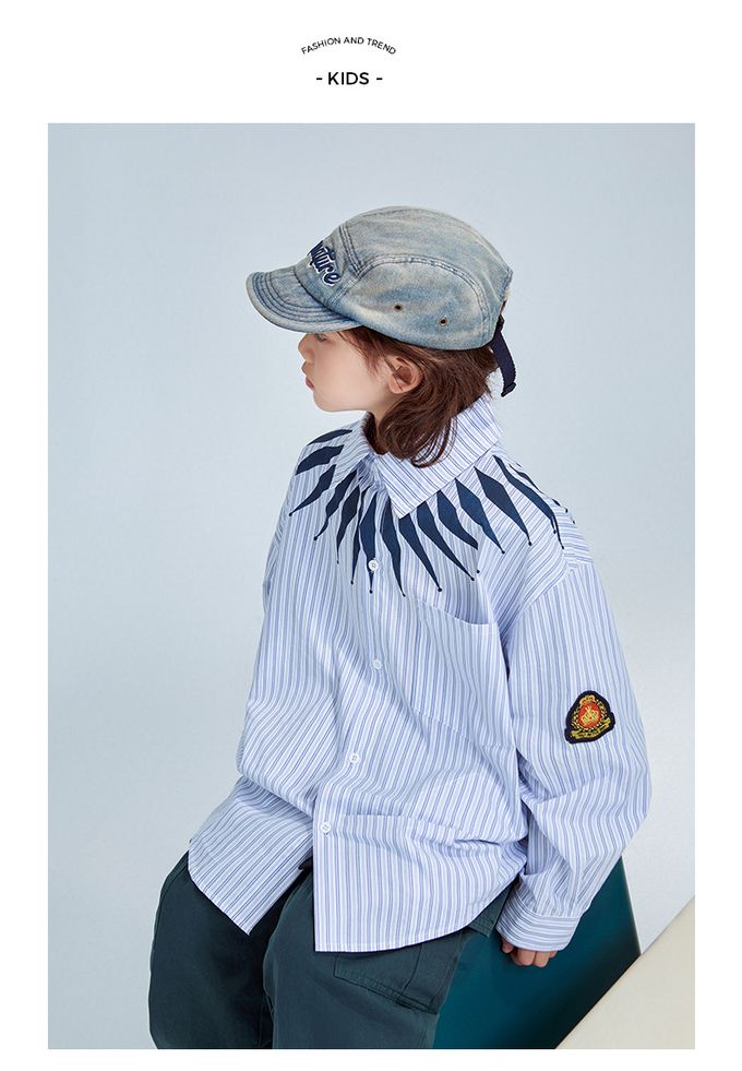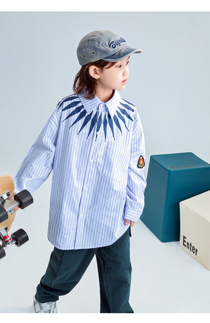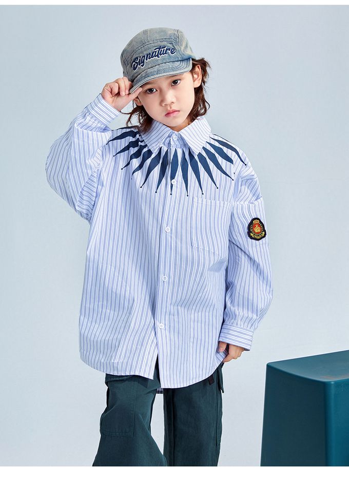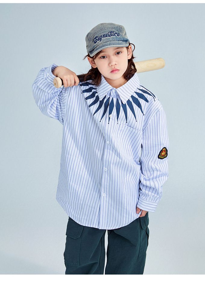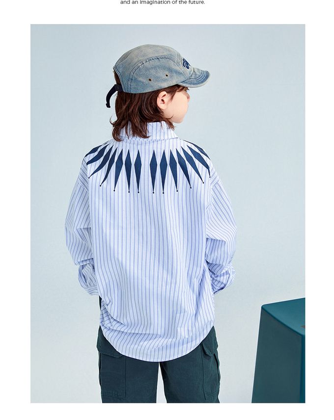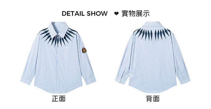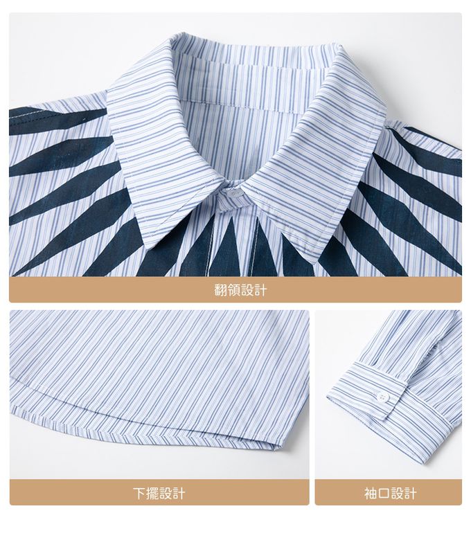 潮流設計感長袖襯衫-領口造型印花-藍色條紋