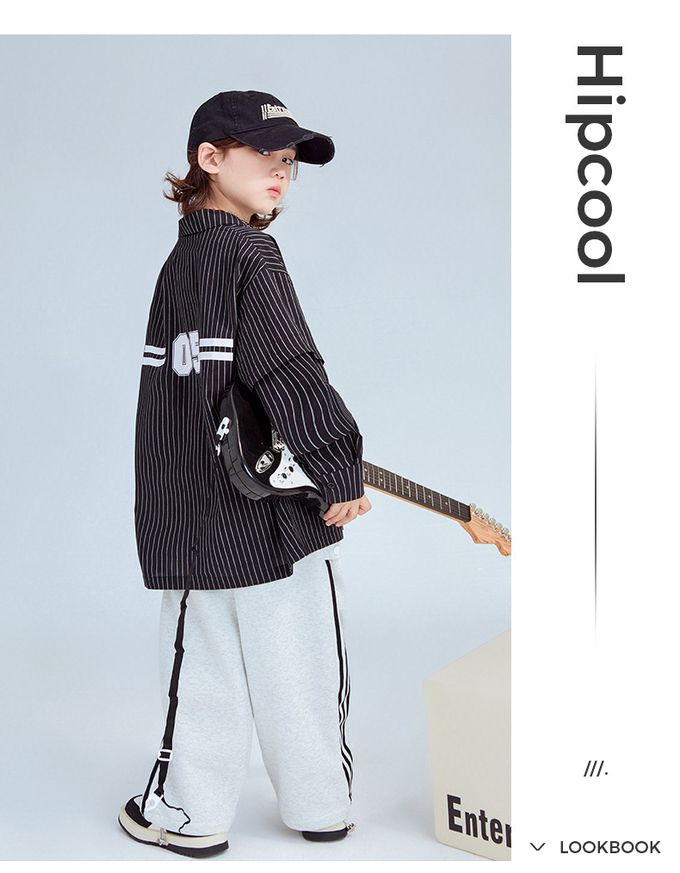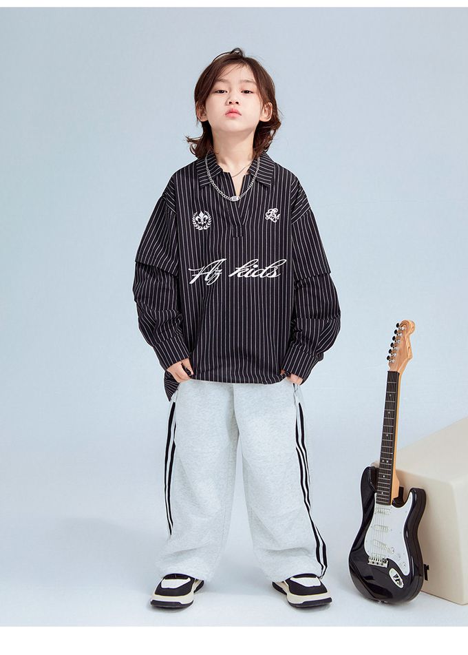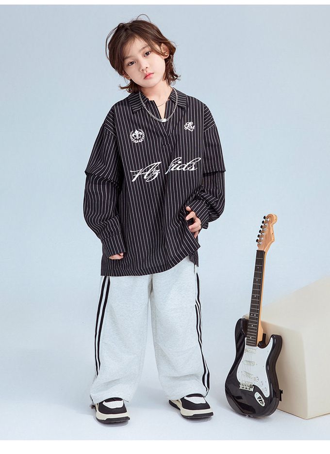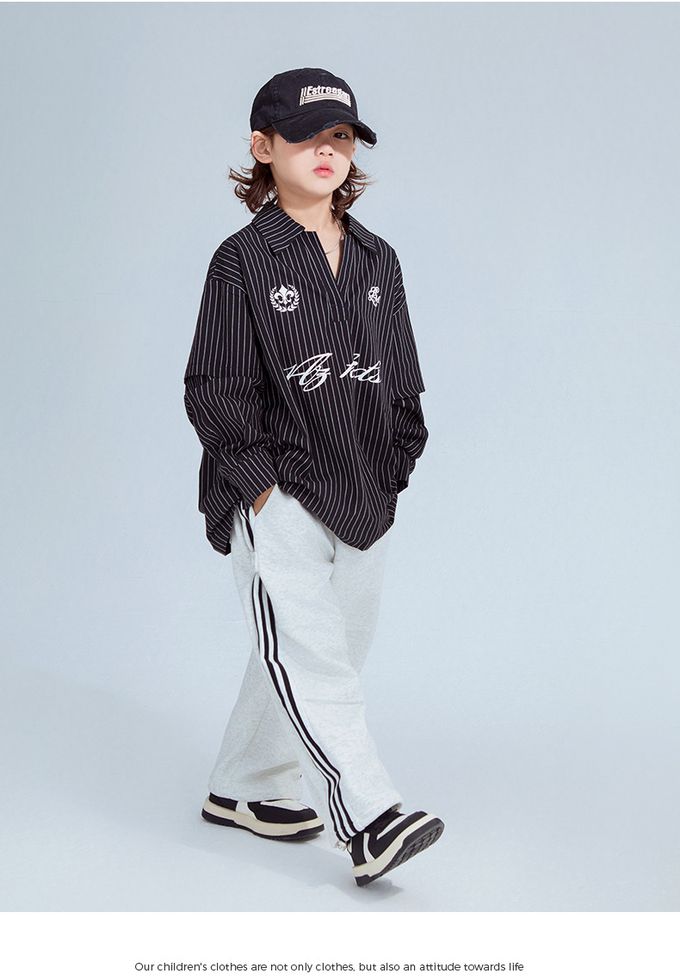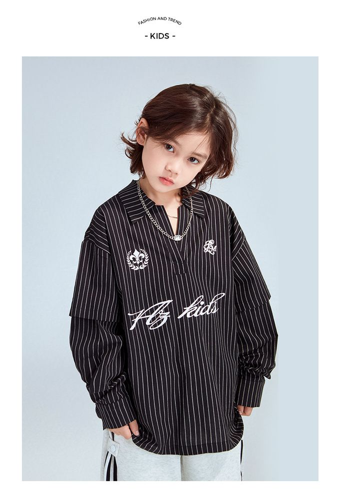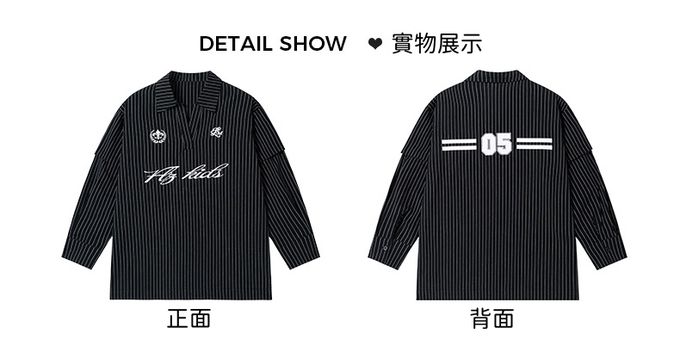 純棉假兩件長袖襯衫-直條字母印花-黑色