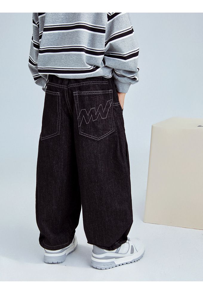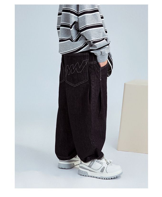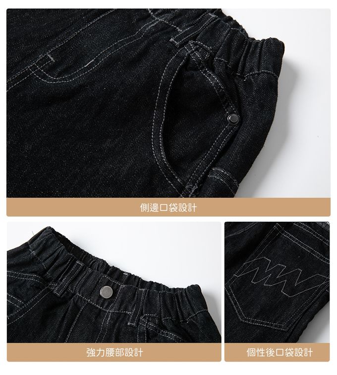 腰鬆緊休閒牛仔長褲-個性後口袋-黑色