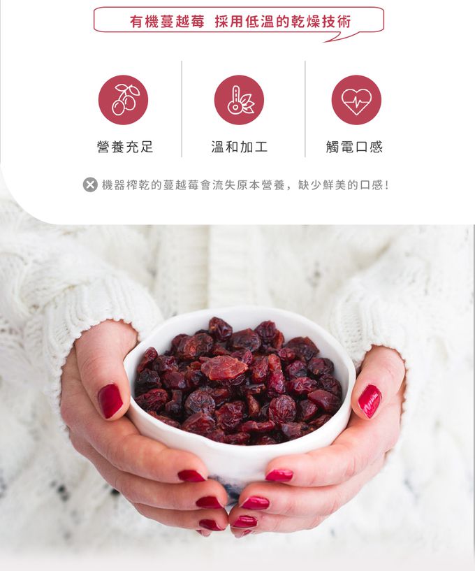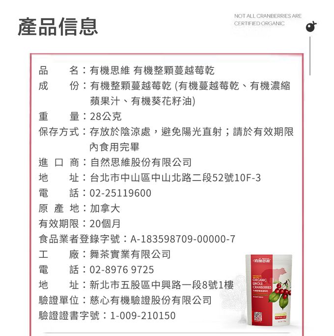 成分:有機蔓越莓乾、有機濃縮蘋果汁、有機葵花籽油
