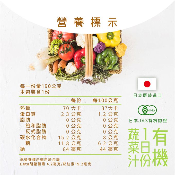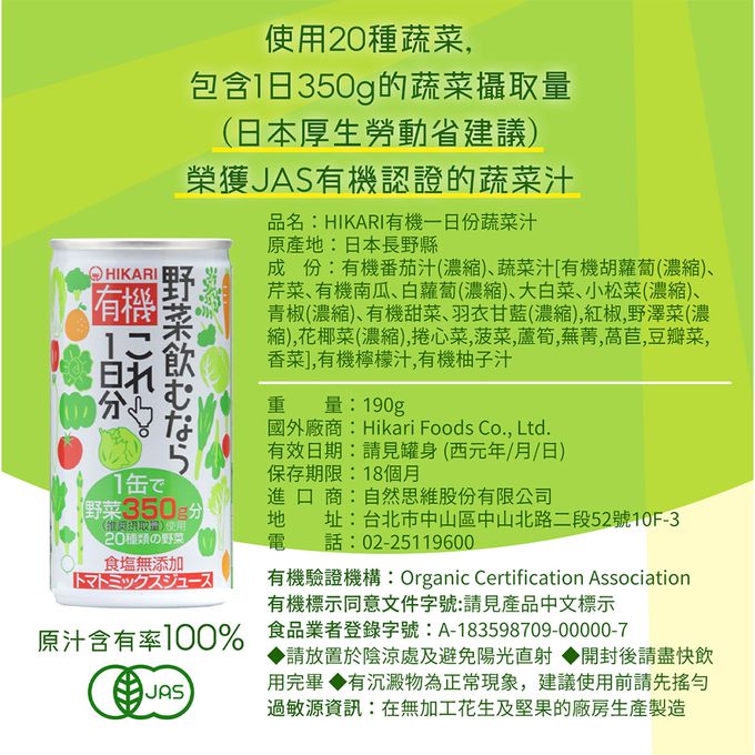 品名:HIKARI有機一日份蔬菜汁190g(30入箱購)