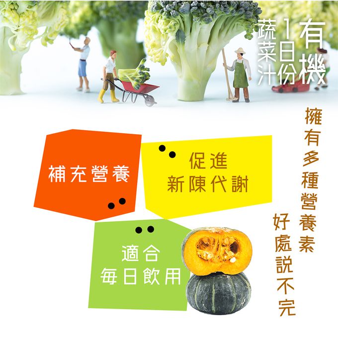 成分:番茄、胡蘿蔔、芹菜、南瓜、白蘿蔔、大白菜、小松菜、青椒、甜菜、羽衣甘藍、紅椒、野澤菜、花椰菜、捲心菜、菠菜、蘆筍、蕪菁、萵苣、豆瓣菜,香菜