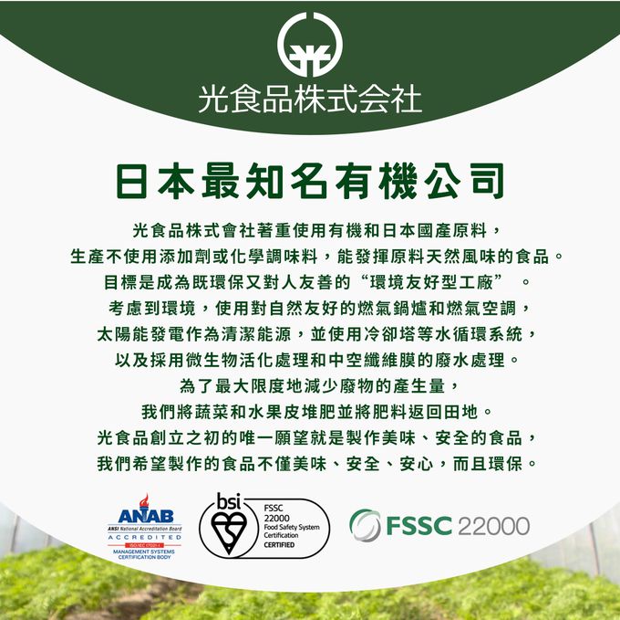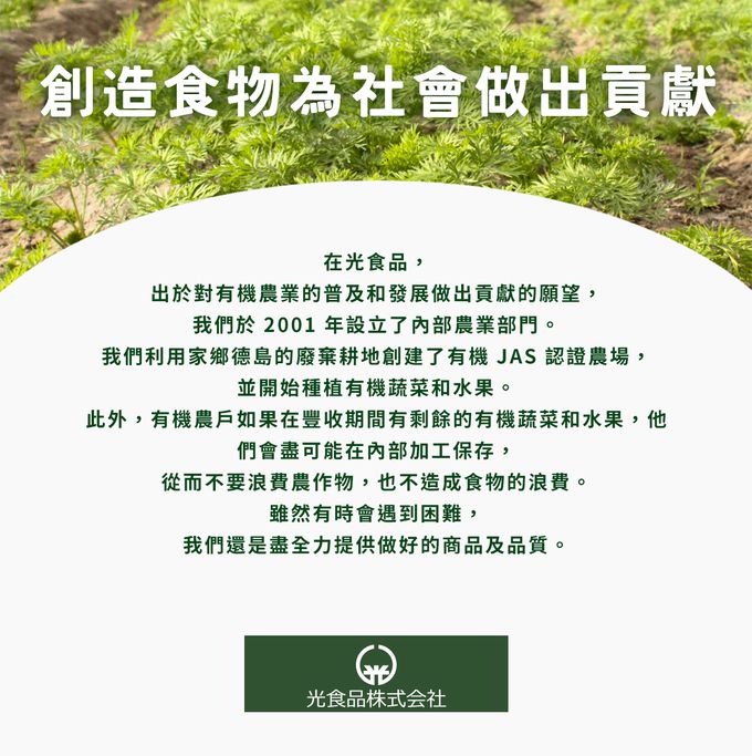 成分:有機蔬菜(有機胡蘿蔔、有機蕃茄、有機南瓜、有機白蘿蔔(根、葉)、有機小松菜、有機空心菜、有機落葵、有機長蒴黃麻、有機捲心菜、有機薑、有機洋蔥、有機青紫蘇)、有機水果(有機香蕉、有機檸檬、有機蜜柑)。