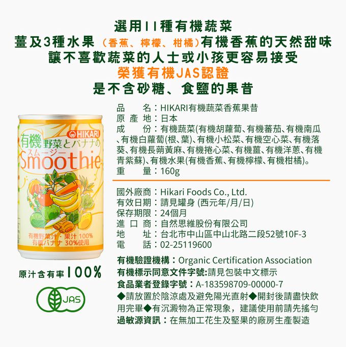 品名:HIKARI有機蔬菜香蕉果昔160g(30入箱購)