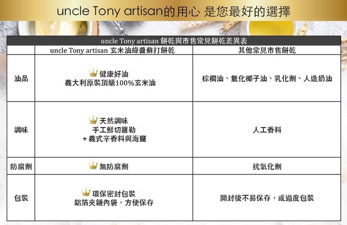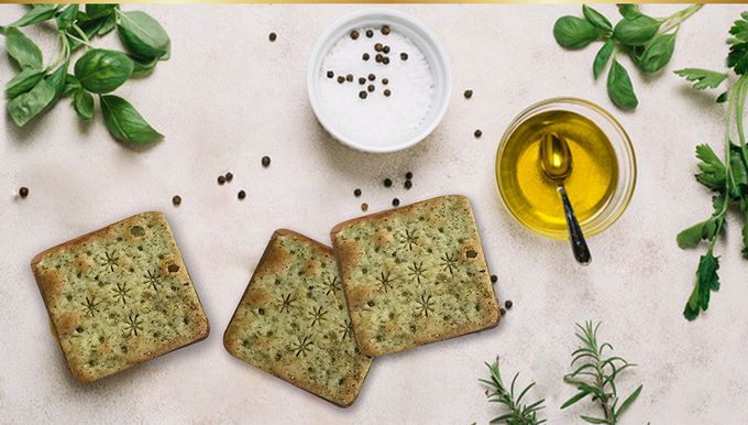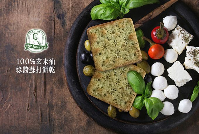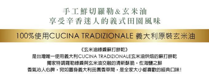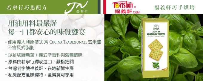 使用義大利Cucina Tradizionale 100%純玄米油製作的蘇打餅乾取代各種不健康的油脂,無反式脂肪。全素可享 ! 若寧行獨家配方與台灣著名《福義軒餅家》巧手烘焙新鮮特調的羅勒綠醬(九層塔)與玄米油交融的醇厚底蘊,佐海鹽之鮮,香氣沁人心脾,宛如置身義大利田園香草間,是適合全家人的超人氣健康餅乾!