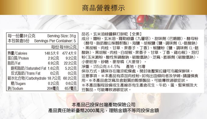 成分:麵粉、玄米油、羅勒綠醬(九層塔)、甜味劑(巴糖醇)、酵母粉(酵母、脂肪酸山梨醇酐酯)、海鹽、胡椒鹽〔鹽、調味劑(L-麩酸鈉)、黑胡椒、肉桂、甘草、眾香子、丁香〕、椒鹽粉〔鹽、調味劑(L-麩酸鈉)、黑胡椒、肉桂、白胡椒、眾香子、甘草、丁香、雞心椒〕、泡打粉(玉米澱粉、酸性焦磷酸鈉、碳酸氫鈉)、芝麻、膨脹劑(碳酸氫鈉)、小麥胚芽、砂糖、麥芽精(大麥芽)。