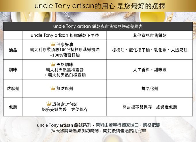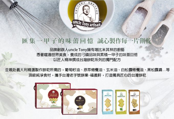 由義大利原裝進口的天然松露調味,和原萃橄欖油及葡葡籽油代替各種不健康的油脂進行製作,授權臺灣福義軒餅家,突破傳統製餅限制,以繁複工藝巧手烘焙,臻至完美。