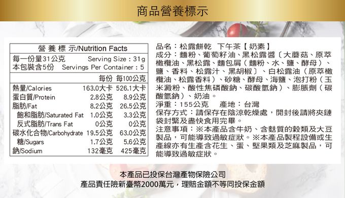 成分: 麵粉、葡萄籽油、 黑松露醬、鹽、香料、松露汁、黑胡椒、白松露橄欖油、奶油、砂糖、酵母、海鹽、泡打粉、膨脹劑(碳酸氫鈉)。