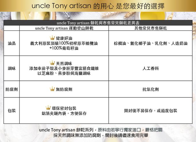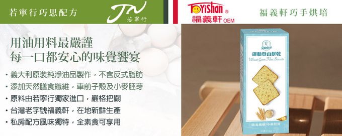添加洋車前子殼及小麥胚芽,含膳食纖維! 每4-6片配200cc水即有飽足感。適合外出登山健行等活動時攜帶,是可隨時保持體力的好口糧,可及時發揮作用。由知名嘉義餅乾廠福義軒代工,若寧行獨家販售。均使用我們自己從義大利進口的Cucina Italiana 100%葡萄籽油,請安心食用。無反式脂肪。