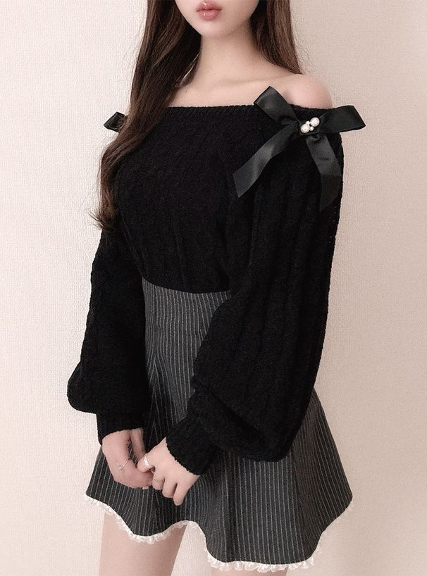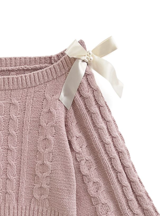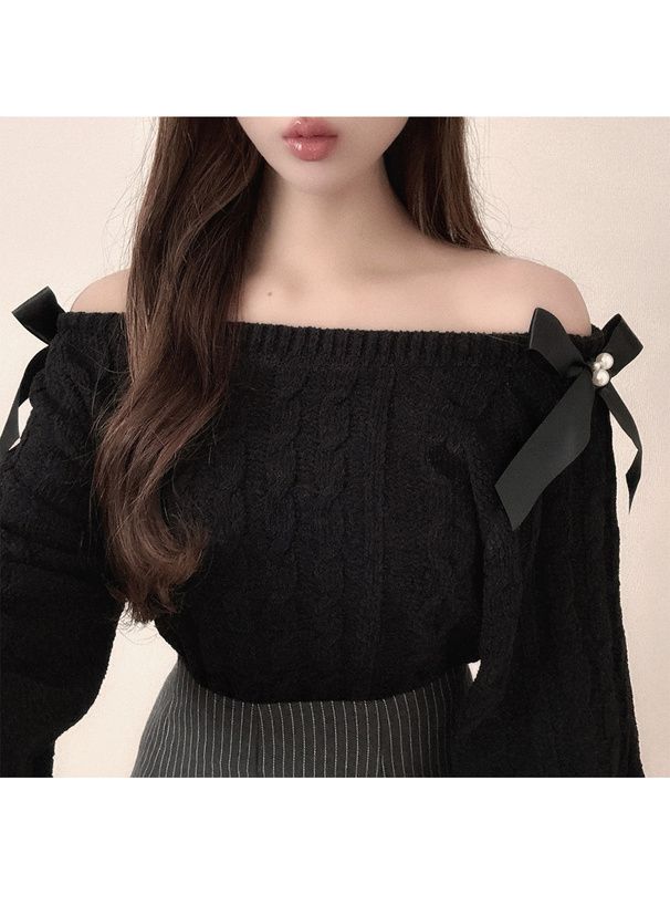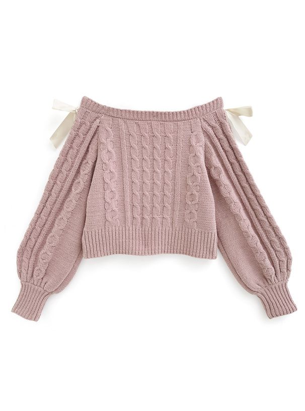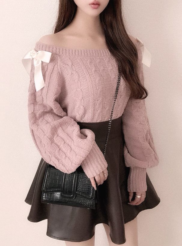 • 品名:甜蜜緞帶露肩麻花針織上衣