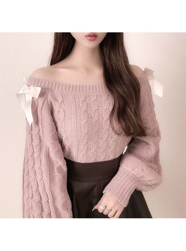日本 GRL - 甜蜜緞帶露肩麻花針織上衣-粉紅 (F)