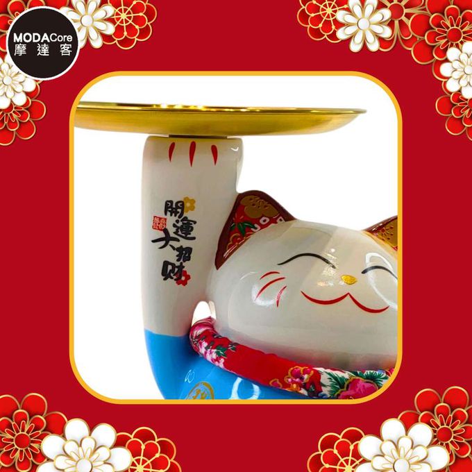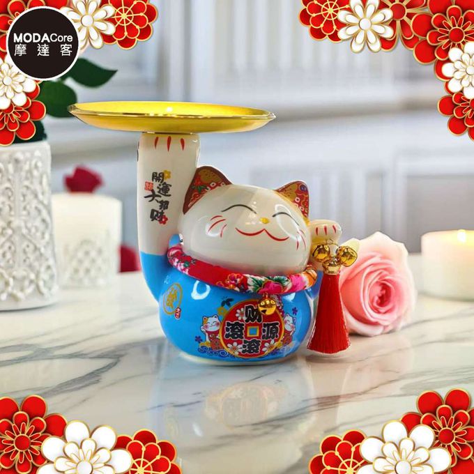 ◉春節開運◉財源滾滾頂盤陶瓷招財貓-托盤藍色款_撲滿存錢桶擺飾桌飾