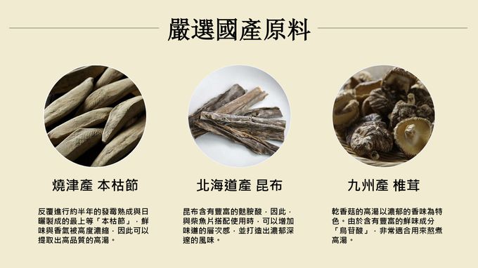 成分:風味原料(牡蠣萃取物、魚貝類萃取物(蛤蠣萃取物、木薯、食鹽)、鰹魚乾削片、昆布、乾燥香菇、澱粉分解物(玉米、馬鈴薯、番薯)、食鹽、蛋白質水解物(大豆)、酵母萃取物、醬油(大豆、小麥、食鹽)、麵包酵母、發酵調味料[脫脂加工大豆、小麥、食鹽、甘蔗、 糊精(木薯澱粉、玉米、馬鈴薯、番薯)]/調味料(L-麩酸鈉)