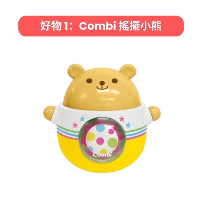 可愛的不倒翁小熊,鈴鈴鈴~左右搖擺著,肚子的轉盤會跟著動喔!小寶寶總是看得很專心。小小的腦袋裡一定大感驚奇,三個月大會趴了之後,開始用眼睛探所這個世界。