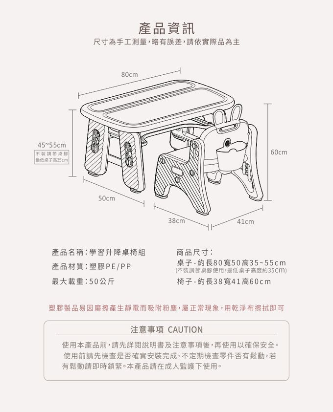 詳細尺寸:桌子 - 約80X50X35~55cm|椅子 - 約38X41X60cm