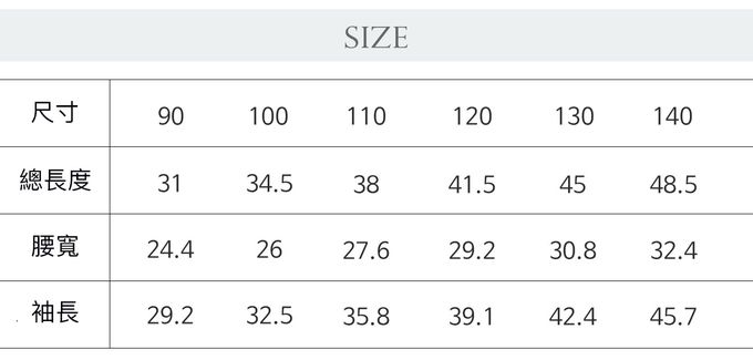 2. 平均尺寸表乃參考平均值制定,每位孩童成長速度略有不同,請參考孩子實際體型、現有衣物尺寸等實際測量結果進行選購。