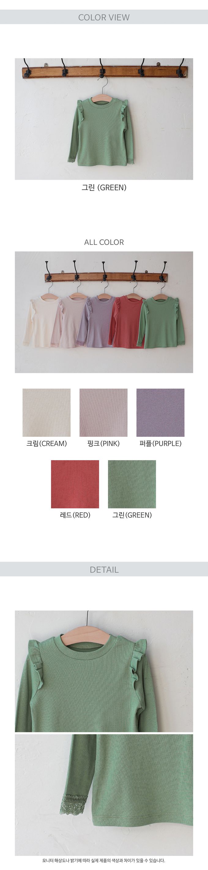 韓國 PuellaFLO - 蕾絲點綴莫代爾混棉彈性長袖上衣-綠