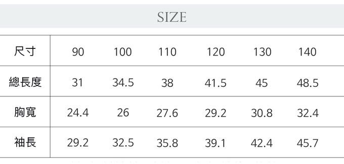 2. 平均尺寸表乃參考平均值制定,每位孩童成長速度略有不同,請參考孩子實際體型、現有衣物尺寸等實際測量結果進行選購。