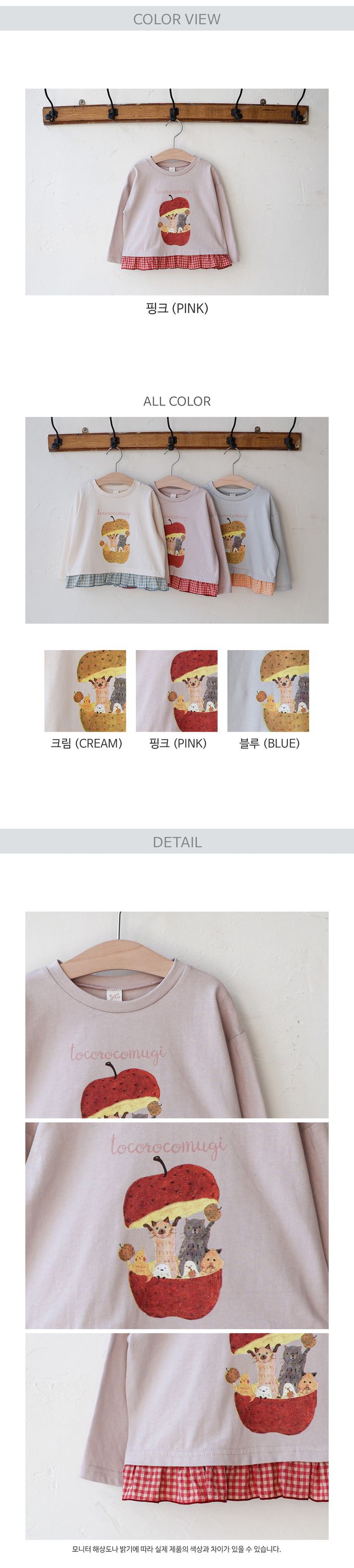 韓國 Puellaflo - 蘋果喵喵格紋點綴長袖上衣-藕粉X紅