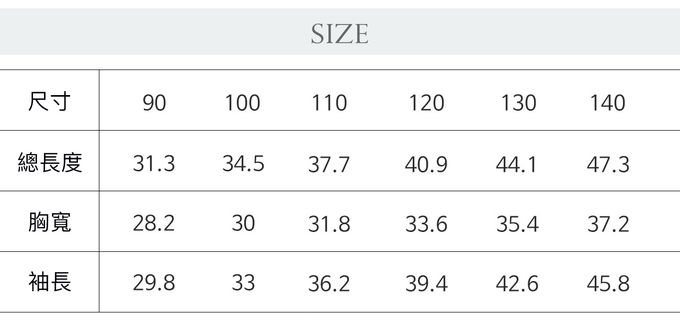 2. 平均尺寸表乃參考平均值制定,每位孩童成長速度略有不同,請參考孩子實際體型、現有衣物尺寸等實際測量結果進行選購。