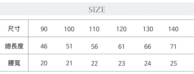 2. 平均尺寸表乃參考平均值制定,每位孩童成長速度略有不同,請參考孩子實際體型、現有衣物尺寸等實際測量結果進行選購。