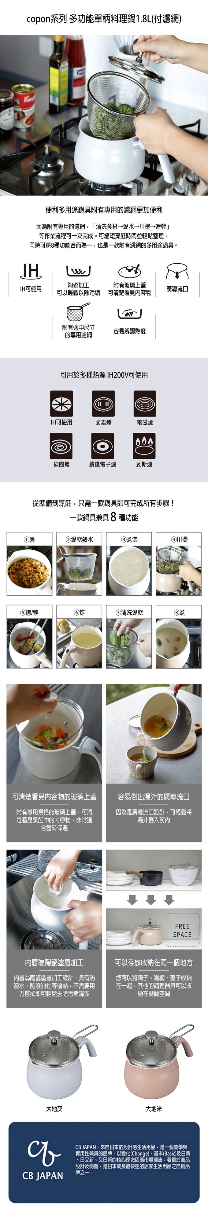 附有專用濾網的多用途鍋具組使用上更為便利,集結煮沸、川燙、清洗瀝乾、煮、褒、瀝乾熱水、烤/炒、炸等8種功能的料理鍋具讓您可輕鬆料理,並可縮短烹飪時間,料理後可簡單清潔整理。