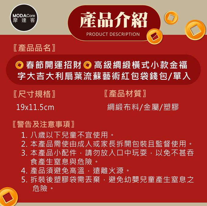 品名:◉春節開運招財◉高級綢緞橫式小款金福字大吉大利扇葉流蘇藝術紅包袋錢包/單入