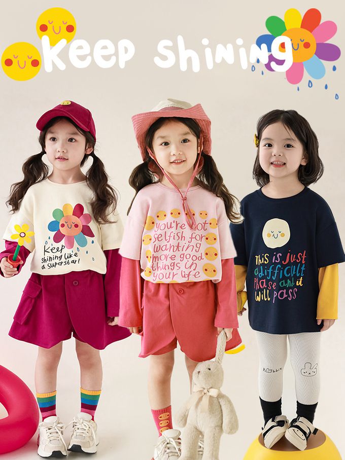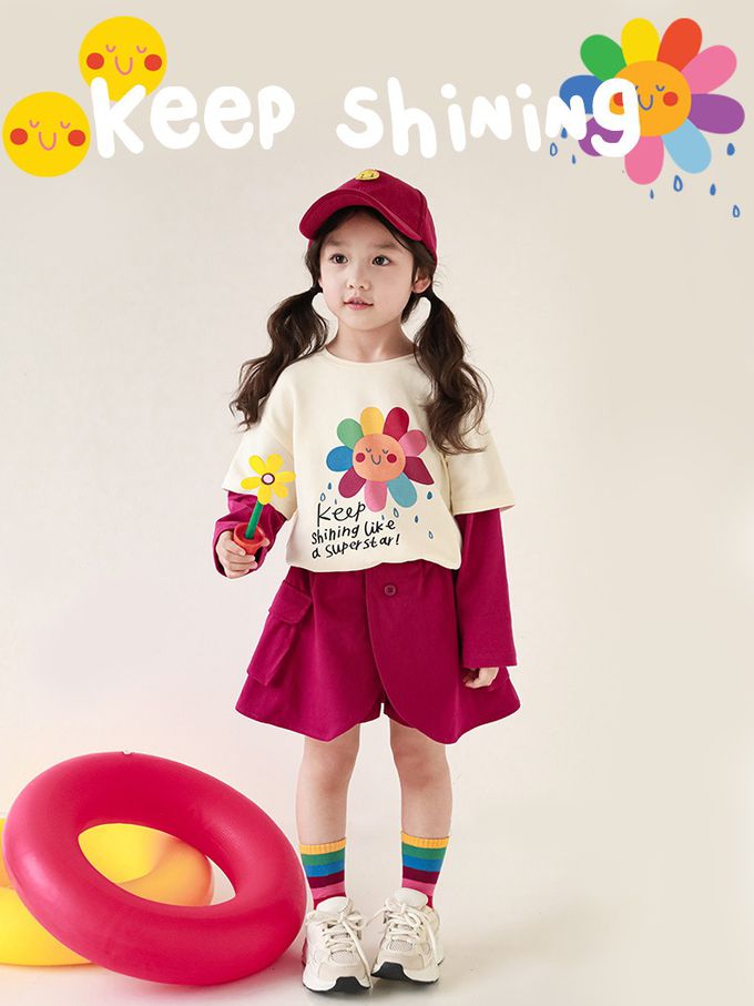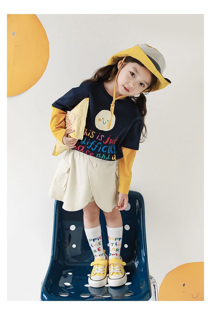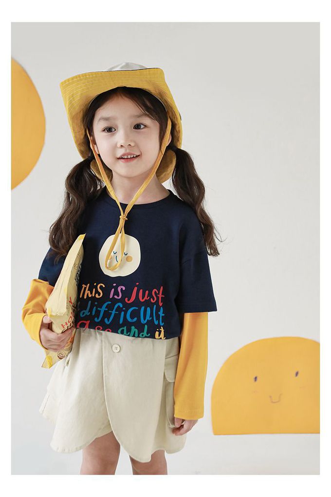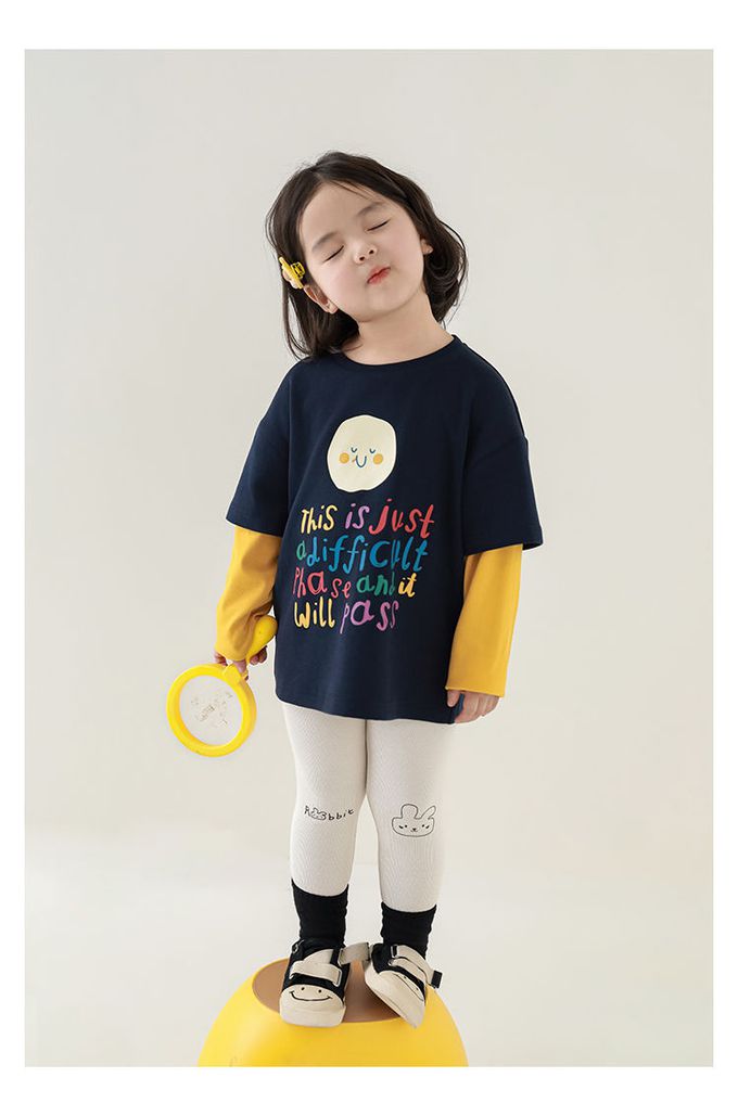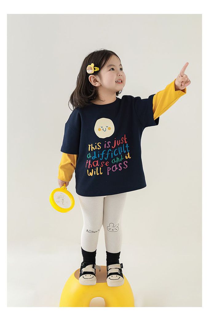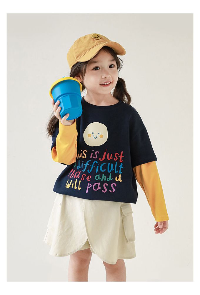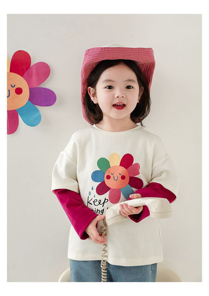 圓領撞色假兩件長袖上衣-笑臉標語-粉色
