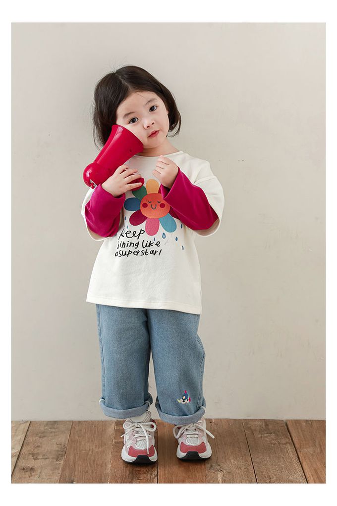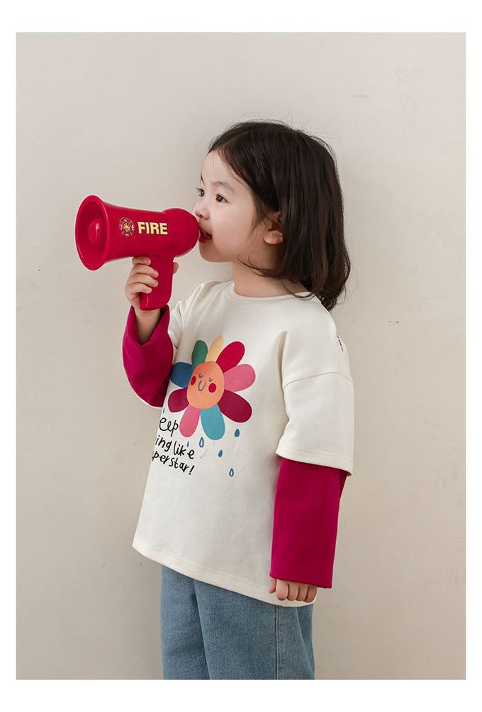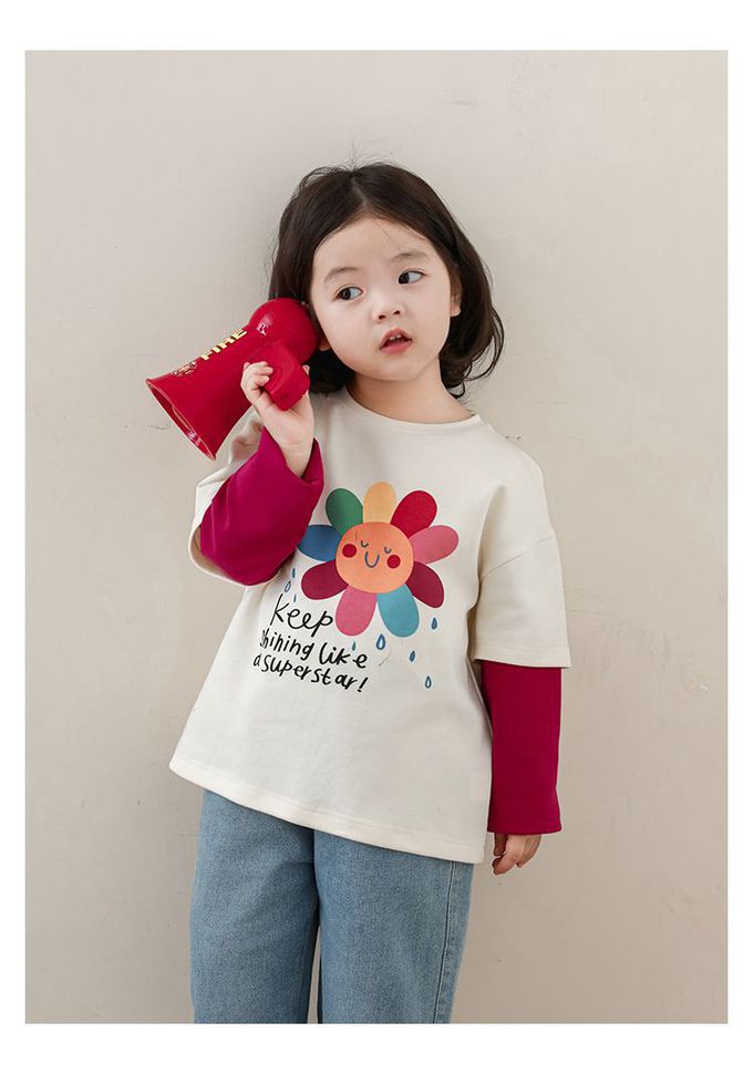 圓領撞色假兩件長袖上衣-彩色花花-米白