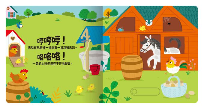 清晰悠揚的聲音,讓人彷彿置身在悠閒的農莊裡,聆聽忙碌動物們合奏的有趣樂曲。此外,本書的音量適中,既不會大到損害孩子的耳朵,也不會小聲到聽不清楚,恰到好處的音量,打造完美的聲音品質!