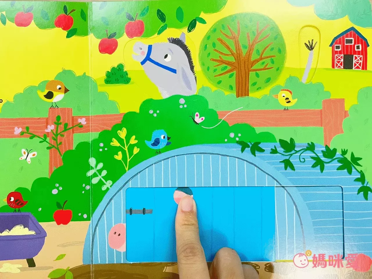 書中內頁會根據動物的外型輪廓設計形狀凹槽,例如驢子就有挖出一個立體的凹槽,讓孩子動手觸摸書。另外,滑動機關的動作可以訓練孩子的手部肌肉,藉以訓練孩子的觸覺發展。