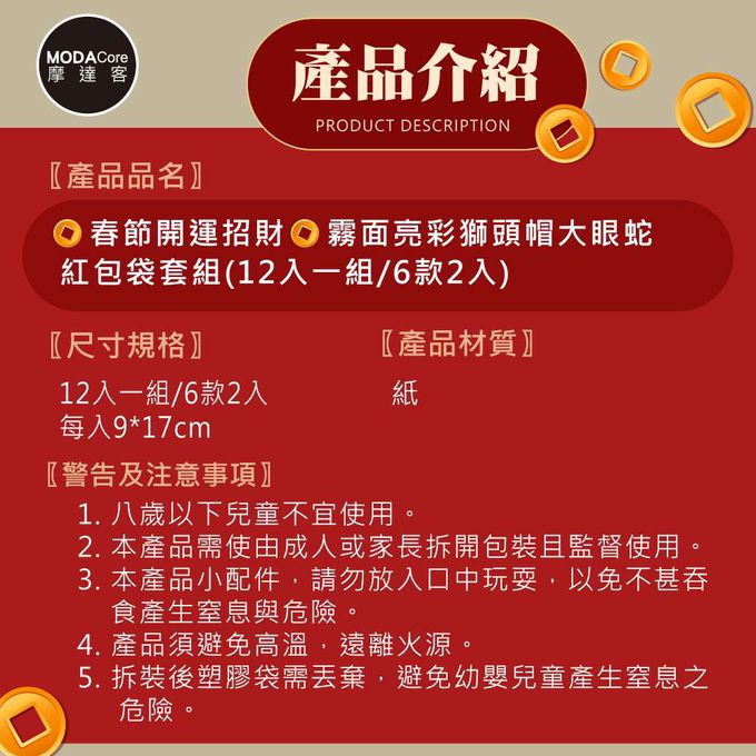 品名:◉春節開運招財◉霧面亮彩獅頭帽大眼蛇紅包袋套組(12入一組/6款2入)