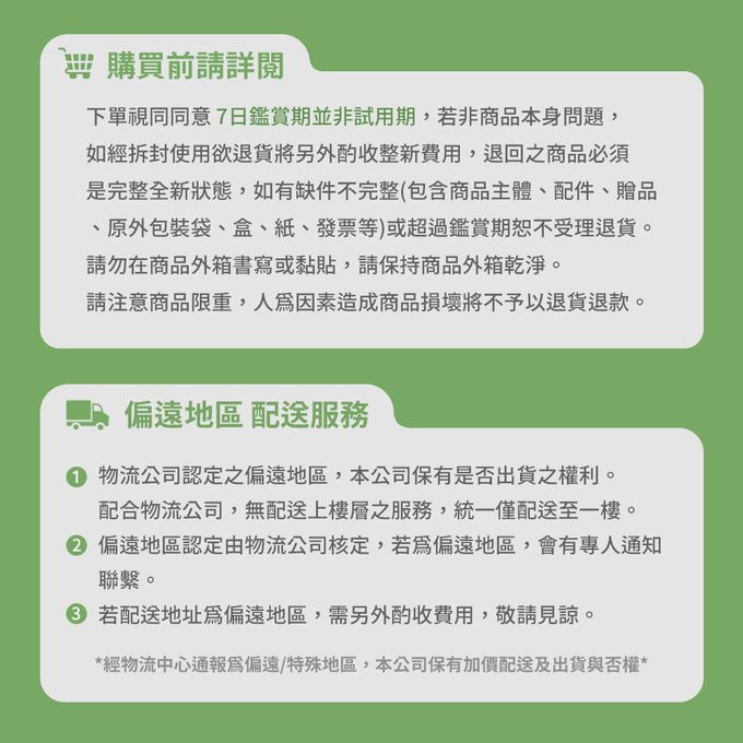 運送服務:目前提供的運送僅限台灣本島。如您位於離島地區,可能會無法配送,或須依據商品需加收離島運費。廠商亦保留出貨與否的權利。離島、偏遠地區、樓層親送等加價費用,可能會另需加收。