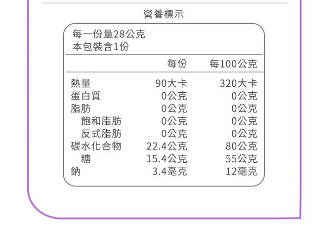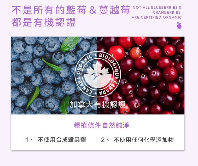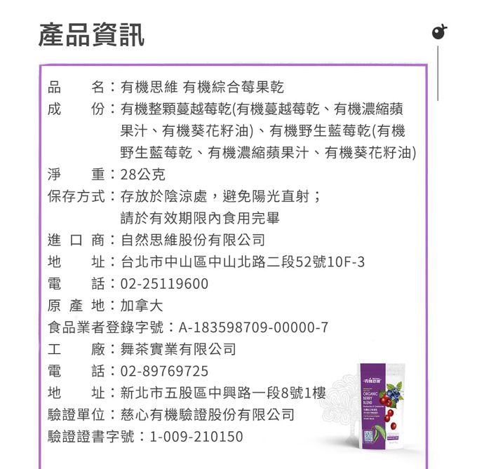 成分:有機蔓越莓乾、有機野生藍莓乾、有機濃縮蘋果汁、有機葵花籽油
