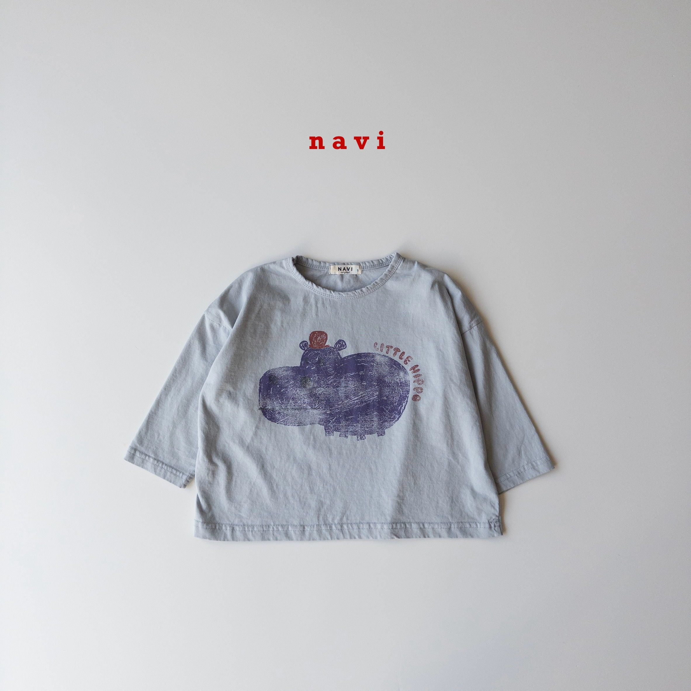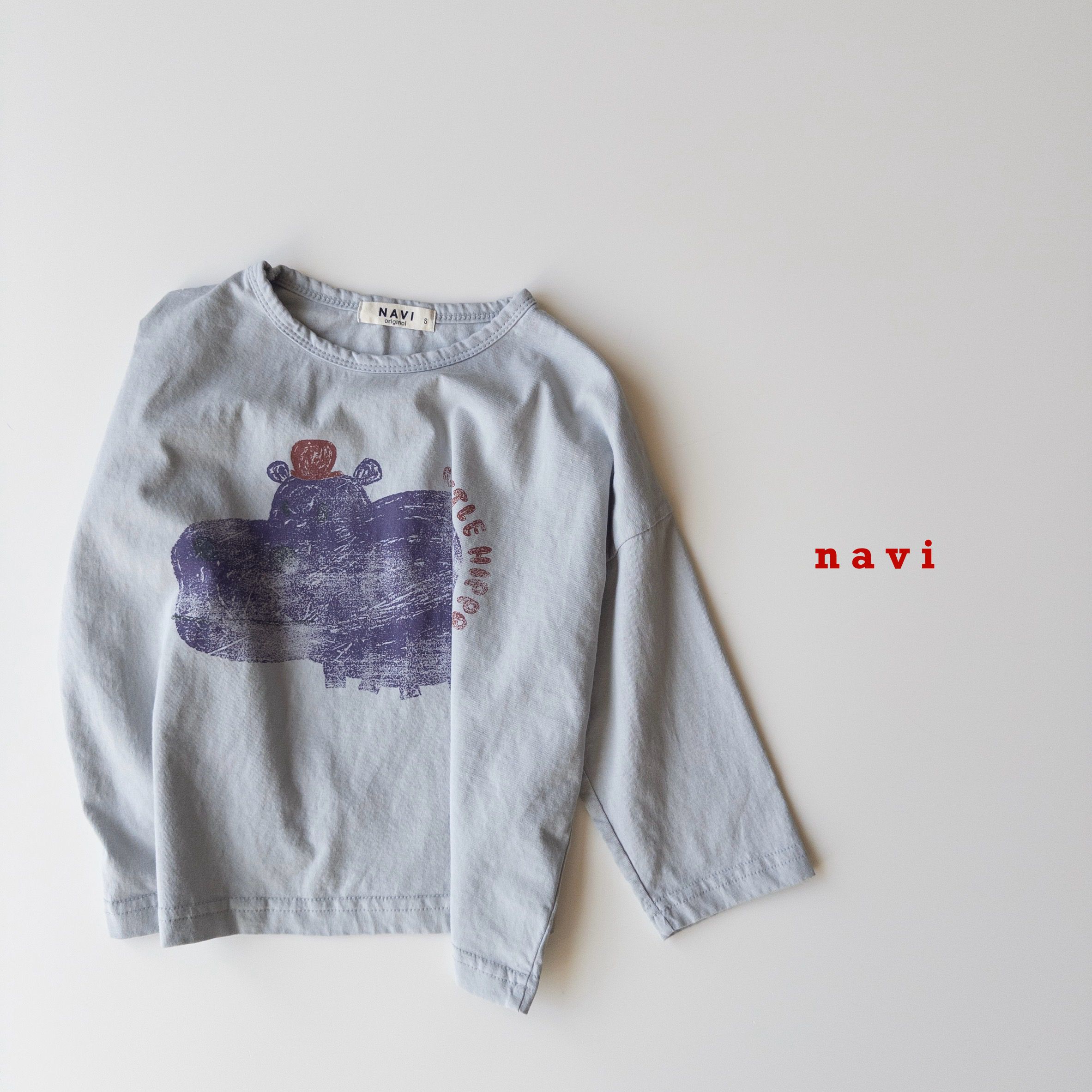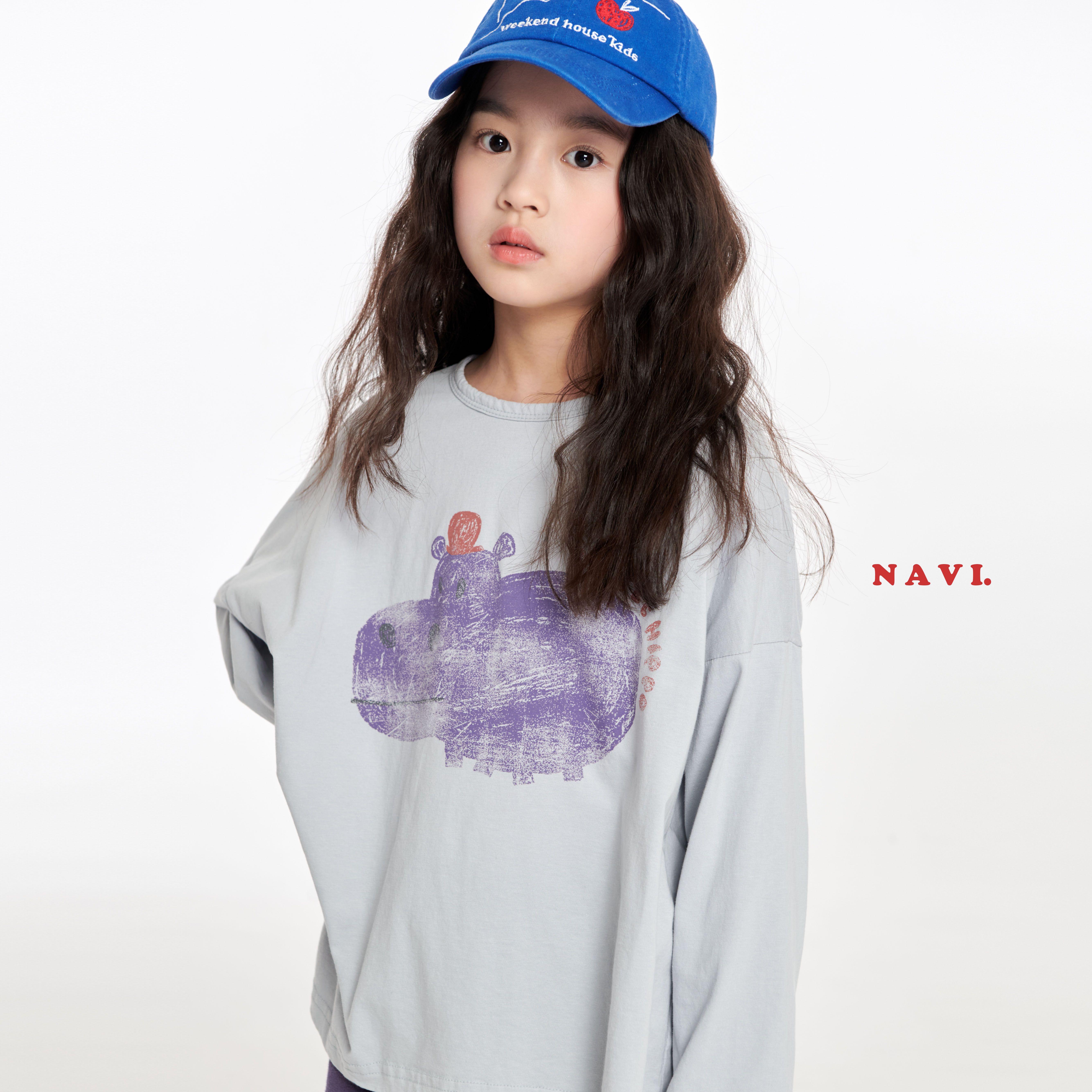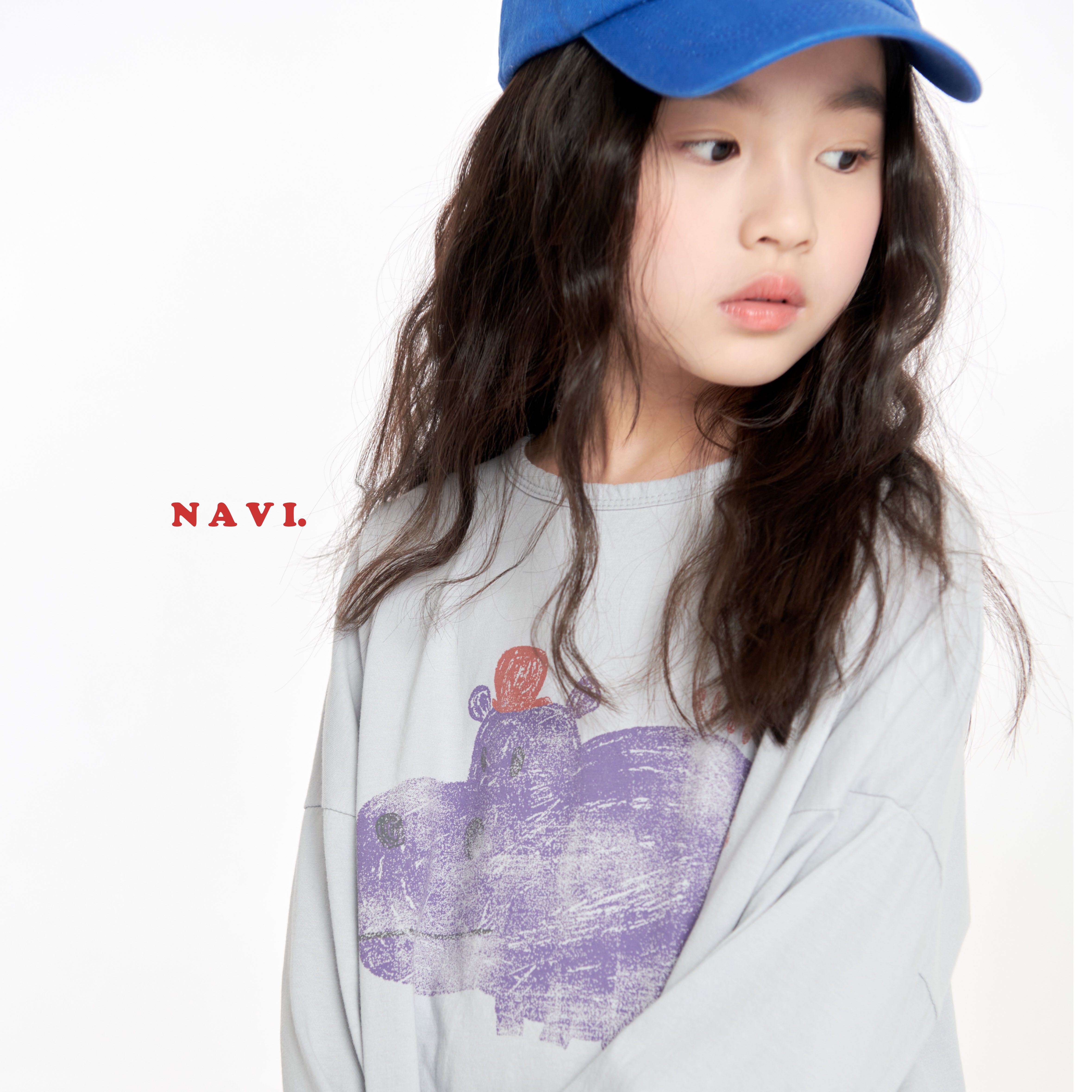 韓國 THE NAVi - 塗鴉河馬純棉落肩長袖上衣-淺灰