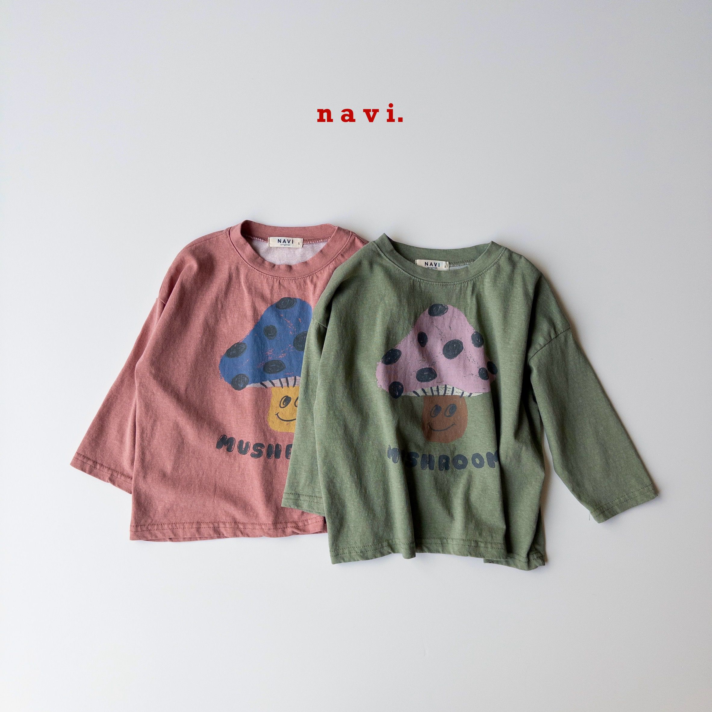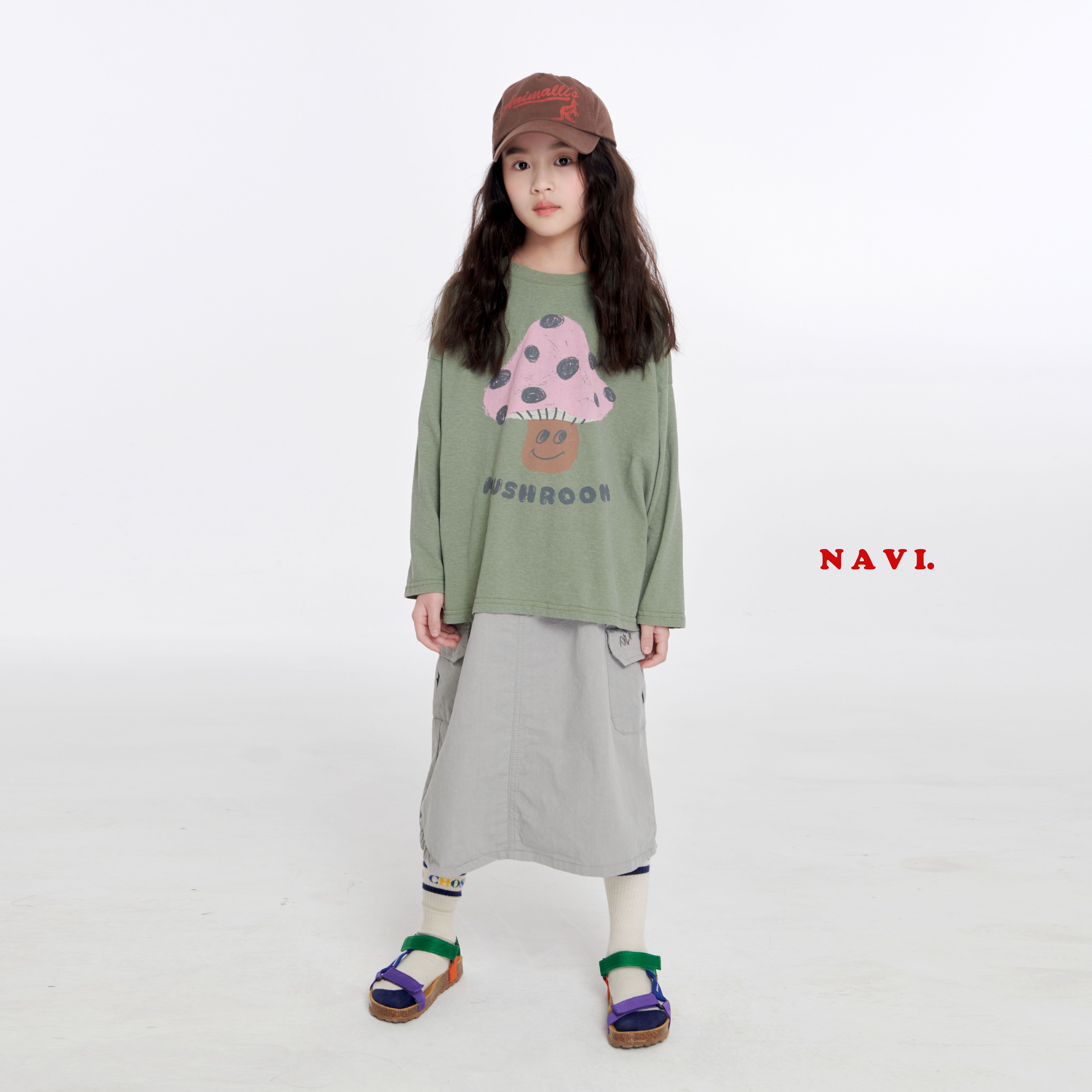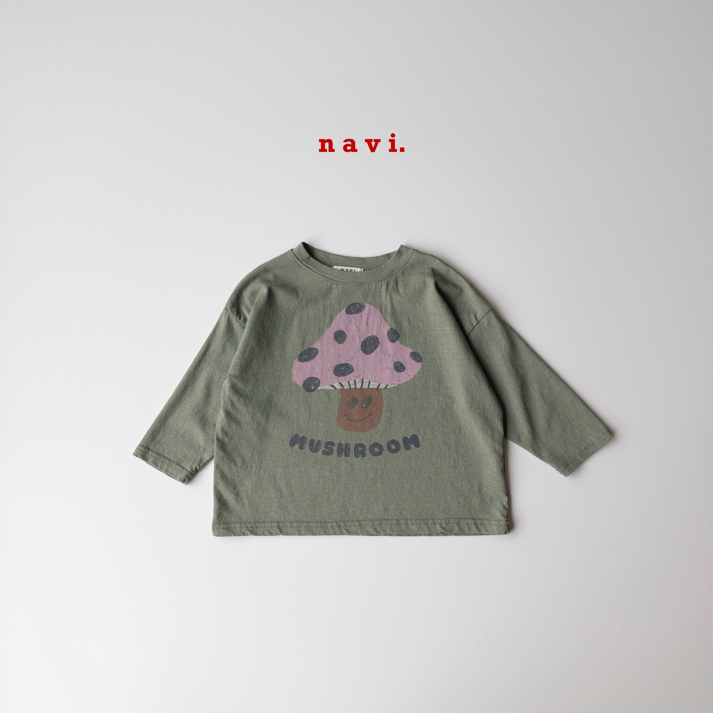 韓國 THE NAVi - 塗鴉點點蘑菇純棉落肩長袖上衣-軍綠